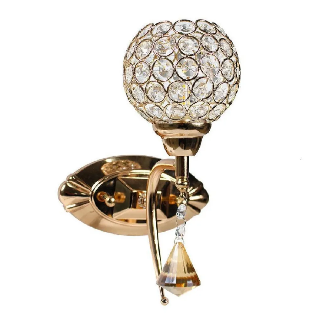 Applique moderno da parete con paralume decorato interamente con cristalli in acrilico che creano un fantastico gioco di luci. Monta un portalampada con attacco G9 con base in metallo lucido argento o oro.