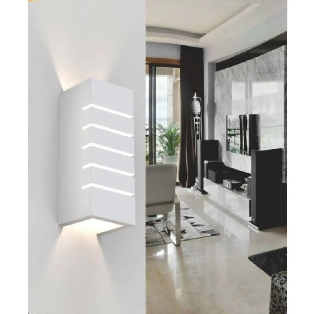 Applique da parete in gesso di forma rettangolare con tagli sul davanti dotato di doppio attacco g9. Realizzato interamente in gesso di colore bianco. Grazie al design moderno è in grado di integrarsi in qualsiasi tipo di ambiente poiché si potrà tinteggiare del colore desiderato. Questo applique ha la particolarità di emettere un doppio fascio luminoso sia verso l’alto sia verso il basso, generando un effetto ottico particolare sulla parete dove è installata.