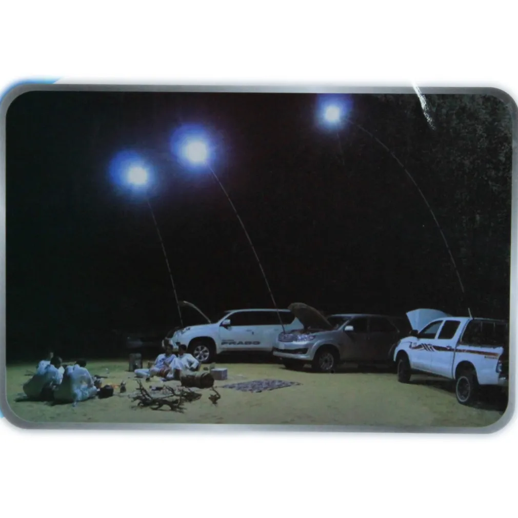 Molto comoda in quanto l’asta(simile ad una canna da pesca) raggionge un altezza di 3,6mt circa illuminando così una vasta area incastrandola nel vano motore della vostra auto, potrete collegarla alla batteria del veicolo e illuminare comodamente senza batterie e pile, collegandolo mediante i morsetti ai poli della batteria o anche grazie all’adattatore 12Volt collegandola direttamente all’accendisigari interno al veicolo.