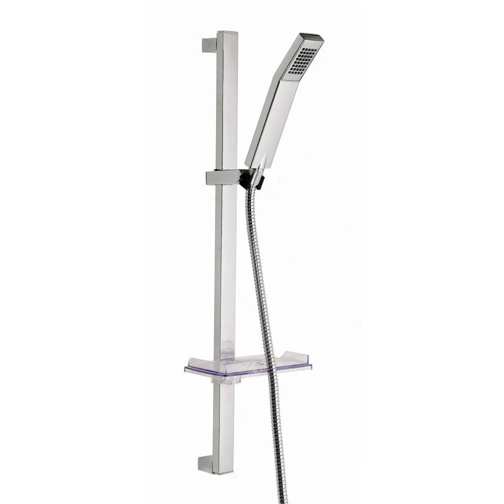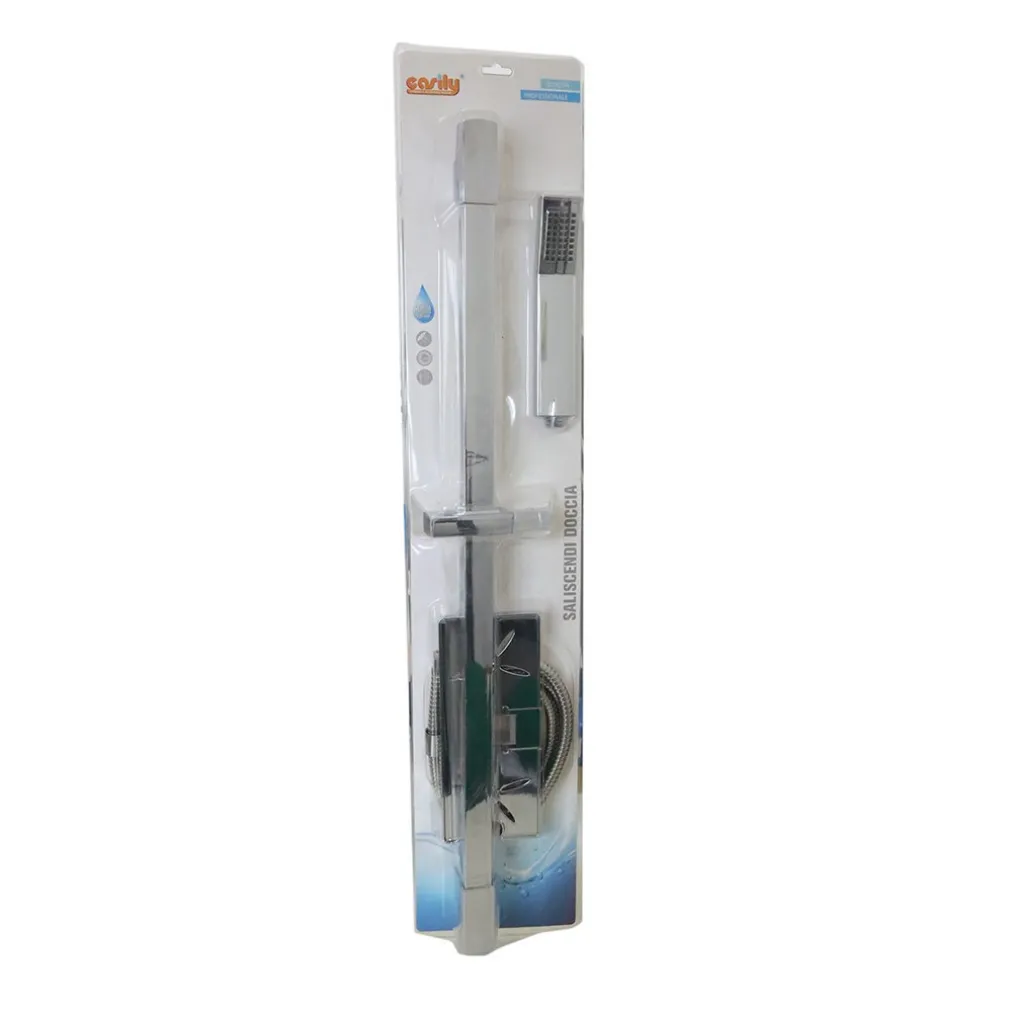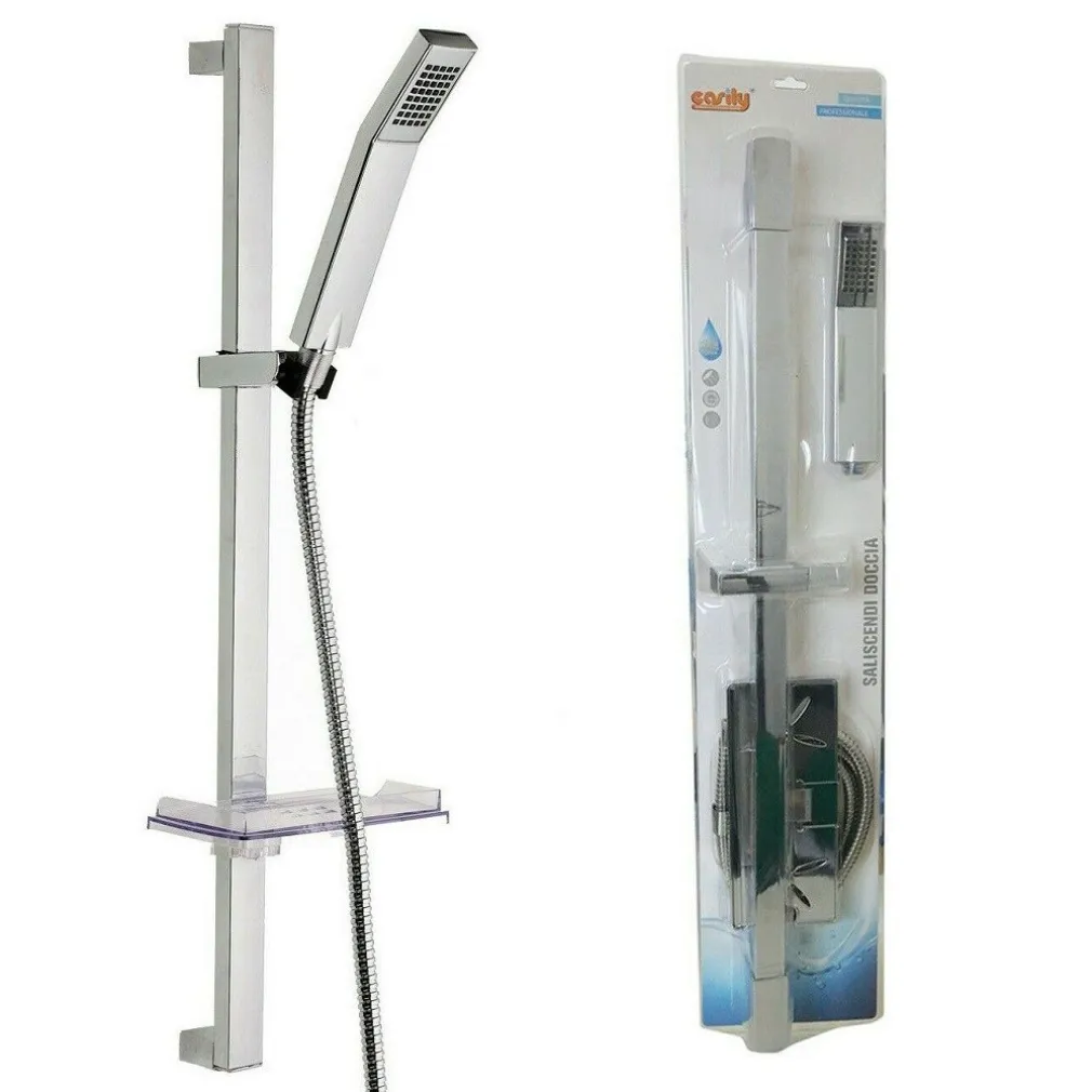 Set asta saliscendi doccia cromato, braccio doccia con soffione di piccole dimensioni amovibile con singolo getto posizionato nell’interno del soffione doccetta, il tutto con tubi flessibile e portasaponetta grande per poterlo subito montare nella vostra doccia o sostituire alla vecchia asta.