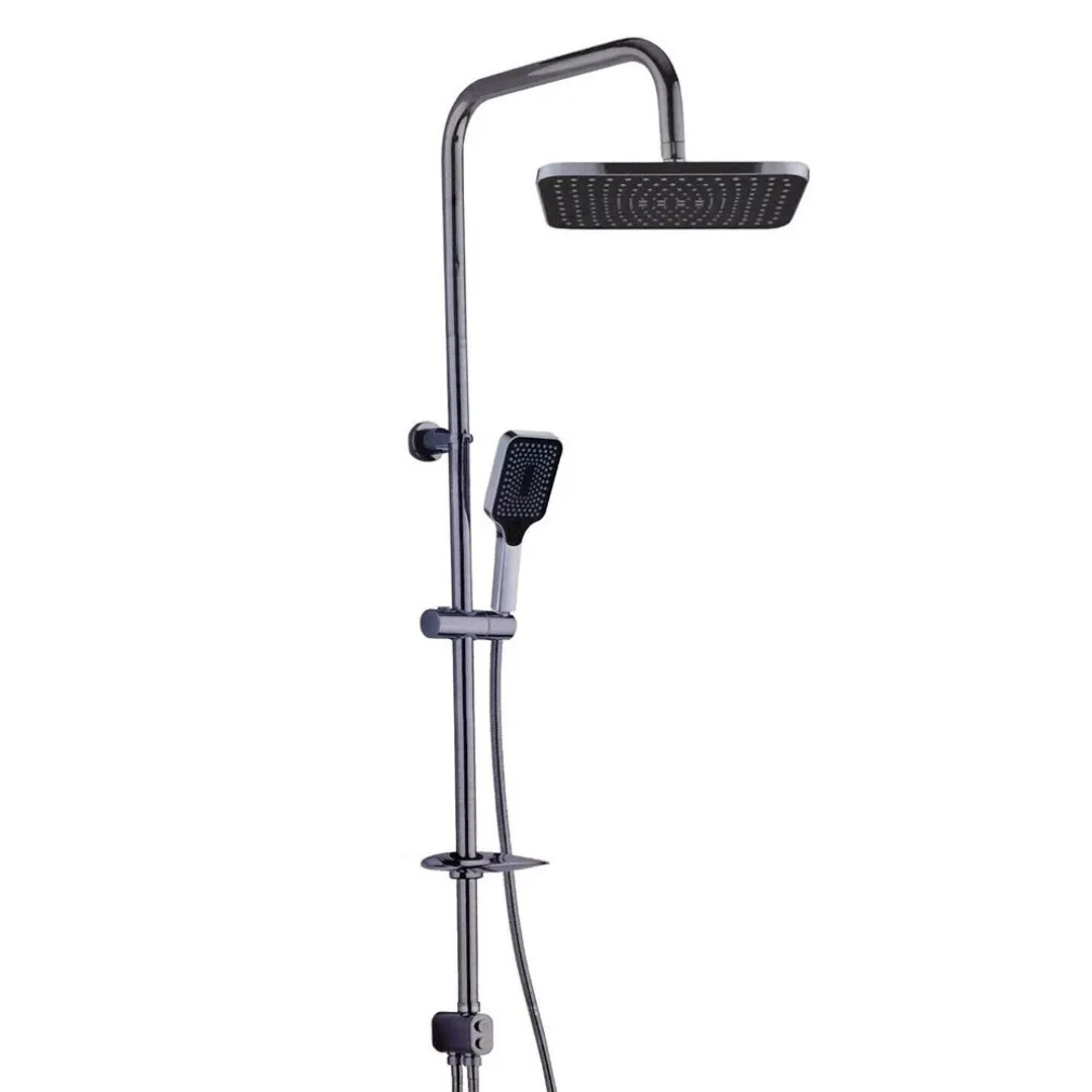 Il set doccia include una asta saliscendi cromata, un soffione fisso quadrato, un braccio doccia con soffione di piccole dimensioni amovibile, un tubo flessibile e un portasaponetta.