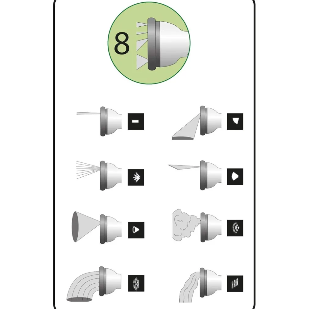 Pistola Multigetto con 8 Funzioni: Per darti il massimo controllo sull’irrigazione, forniamo una pistola multigetto con 8 diverse funzioni. Puoi scegliere il getto più adatto alle tue esigenze, che sia per l’innaffiatura delicata dei fiori o la pulizia più intensa.