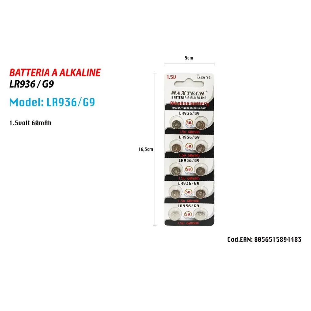 BATTERIE PILE ALKALINE LR936/G9 1.5V BOTTONE 60MAH PER OROLOGI TELECOMANDI MAXTECH