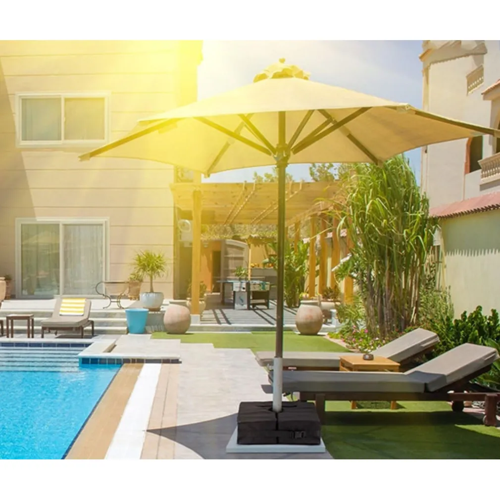 ❓ Quali sono i vantaggi di una base riempibile con sabbia? ✔️ La sabbia aggiunge il peso necessario per evitare che l’ombrellone si ribalti, mentre il design pieghevole permette un facile trasporto e stoccaggio.