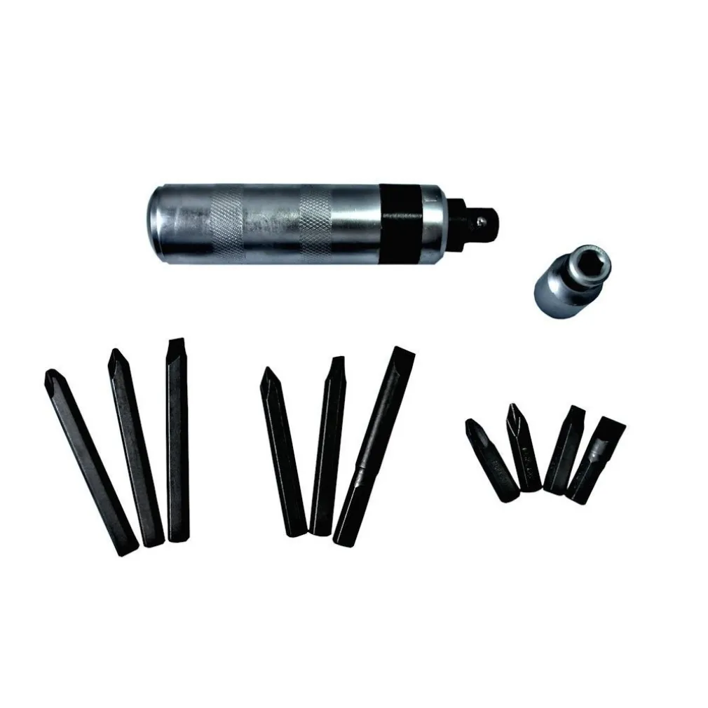 IL KIT SI COMPONE DI 1 MANICO GIRAVITE AD IMPATTO-PERCUSSIONE, REVERSIBILE INTERAMENTE IN ACCIAIO CHROME VANADIUM, CON ATTACCO DA 1/2 E ADATTATORE PER PUNTE GIRAVITE.