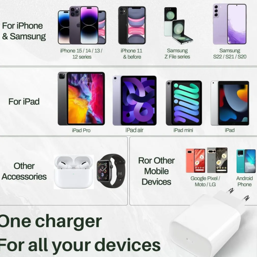 Con una vasta gamma di compatibilità, questo caricabatterie è perfetto per una serie di dispositivi, inclusi iPhone 15/15 Plus/15 Pro Max/15 Pro/14/14 Plus/14 Pro/14 Pro Max/13 Pro Max/13 Pro/13/13 Mini/12 Pro/12 /12 Mini/11/11 Pro/11 Pro Max/SE 2020/XS Max/XS/X/XR/8 Plus/8/iPad Pro/iPad Air/iPad/AirPods Pro.