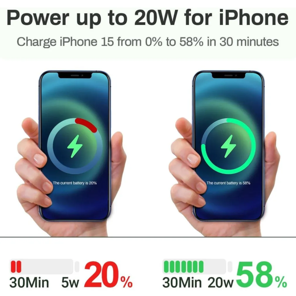 Il Caricatore Rapido USB C 20W rappresenta una vera rivoluzione nella tecnologia di ricarica. Progettato per superare i limiti dei caricatori standard, questo caricabatterie offre una ricarica ultra-veloce, capacità di ricaricare il tuo iPhone fino al 58% in soli 30 minuti – una velocità 3 volte superiore al caricabatterie originale da 5W.
