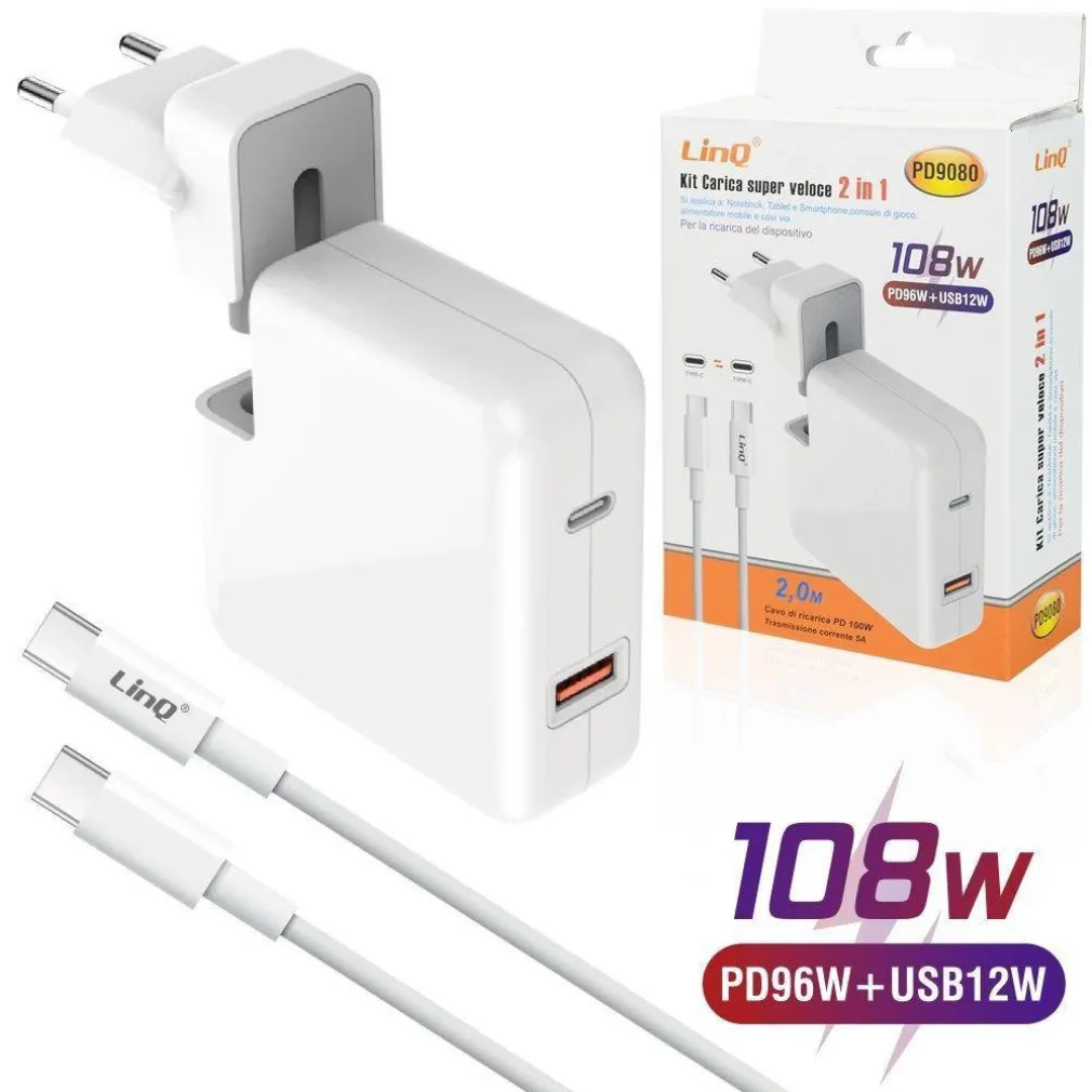CARICABATTERIE 2IN1 SUPER VELOCE PD96W + USB12W TYPE-C NOTEBOOK SMARTPHONE PD9080