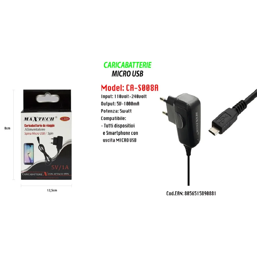 Il caricabatterie micro USB da viaggio spina 5PIN 5V-1000MA 5WATT CA-S008A è l’accessorio ideale per mantenere i tuoi dispositivi sempre carichi, ovunque tu vada. Con le sue specifiche tecniche avanzate e il design compatto, questo caricabatterie offre prestazioni affidabili e convenienza in ogni situazione.