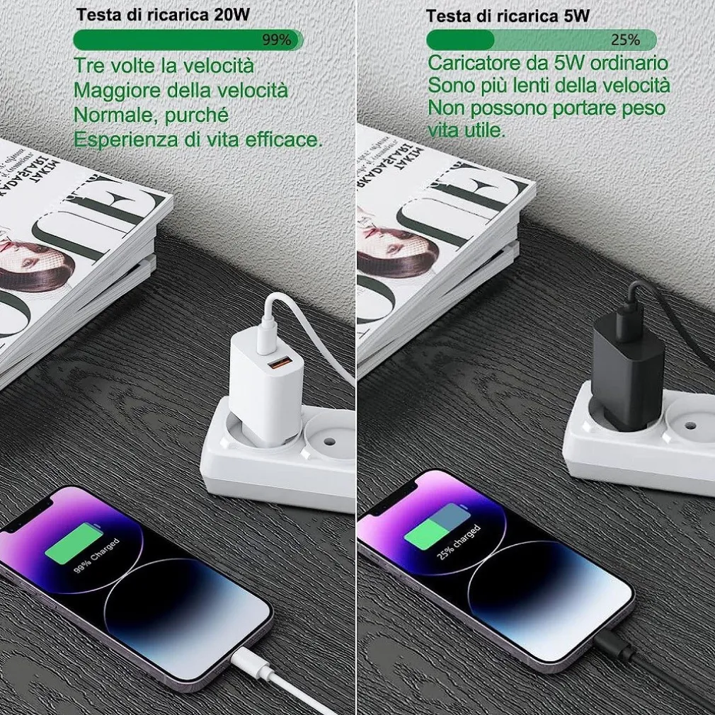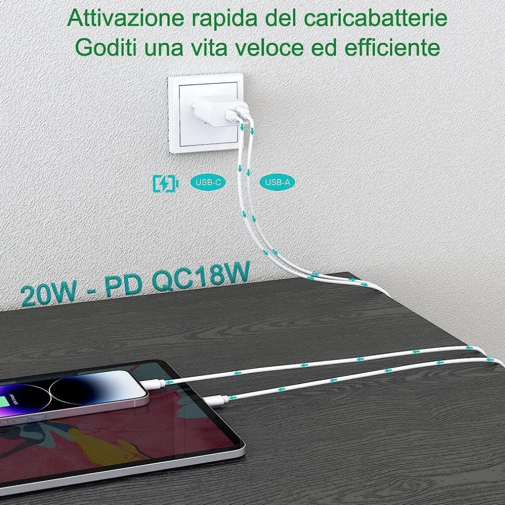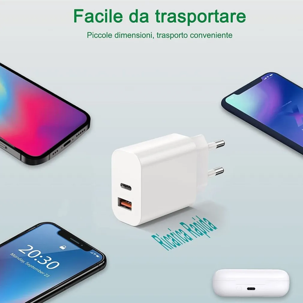 - Caricatore 20W con USB C PD e USB A due porte