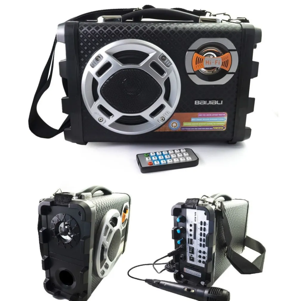 Cassa amplificata con lettore mp3 integrato molto utile per tutti coloro che vogliono avere in un solo dispositivo la possibilità di collegare un microfono ed uno strumento musicale come ad esempio una chitarra o una tastiera musicale. Ideale per feste e party per il karaoke o semplicemente per chi vuole divertirsi cantando. Dotata di comodo manico e comoda tracolla per un facile trasporto. Inoltre grazie alla batteria interna ricaricabile possiamo portarla ovunque senza bisogno di alimentarla tramite presa elettrica. Dotata di interruttore, si alimenta tramite alimentatore 9V per ricaricare la batteria. Sulla parte laterale sono presente gli ingressi USB e SD per la riproduzione dei file mp3, ed il tasto mode che consente di passare alle varie modalità modalità da mp3 a quella di radio FM. Inoltre abbiamo la possibilità di regolare i volumi del microfono e quello generale e l’effetto echo.In dotazione anche un microfono ed un telecomando per gestire tutte le funzioni.