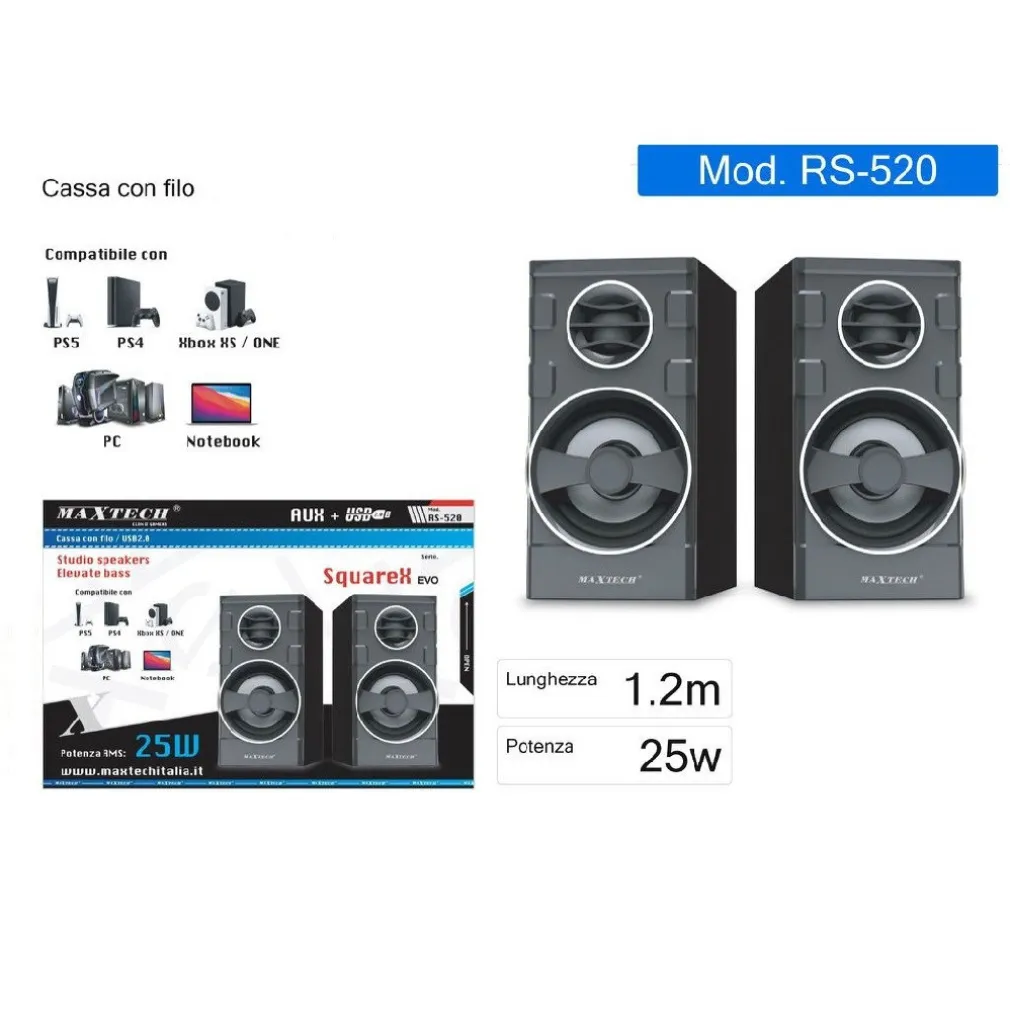 COPPIA CASSE AMPLIFICATE 25 W RMS per PC, NOTEBOOK, PS5, PS4, XBOX XS/ONE, MP3/MP4, MOBILE PHONE e per qualsiasi altro riproduttore sonoro che abbia un entrata con jack. Sono 2 belle casse di dimensioni 17 x 12,5 x 8,5 cm. in Pvc, si presentano molto bene, sono 2 vie, cioè in ogni cassa ci sono 2 altoparlanti, un mini basso, che io chiamerei mid-bass ed un piccolo twiteer per le frequenze alte, ed hanno un regolatore di volume.