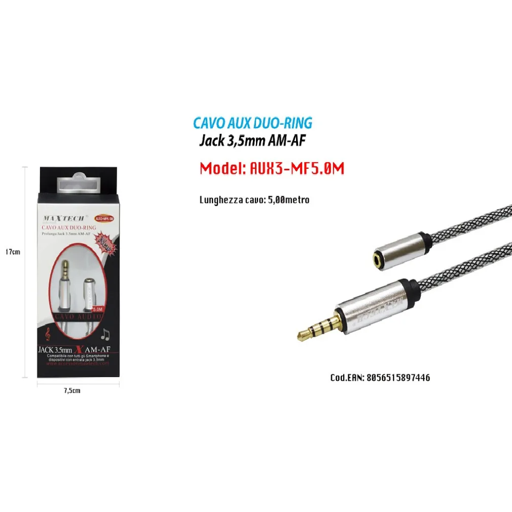 - Cavo Audio Jack 3,5mm da Maschio a Femmina AM/AF 5mt Prolunga AUX MAXTECH AUX3-MF5.0M