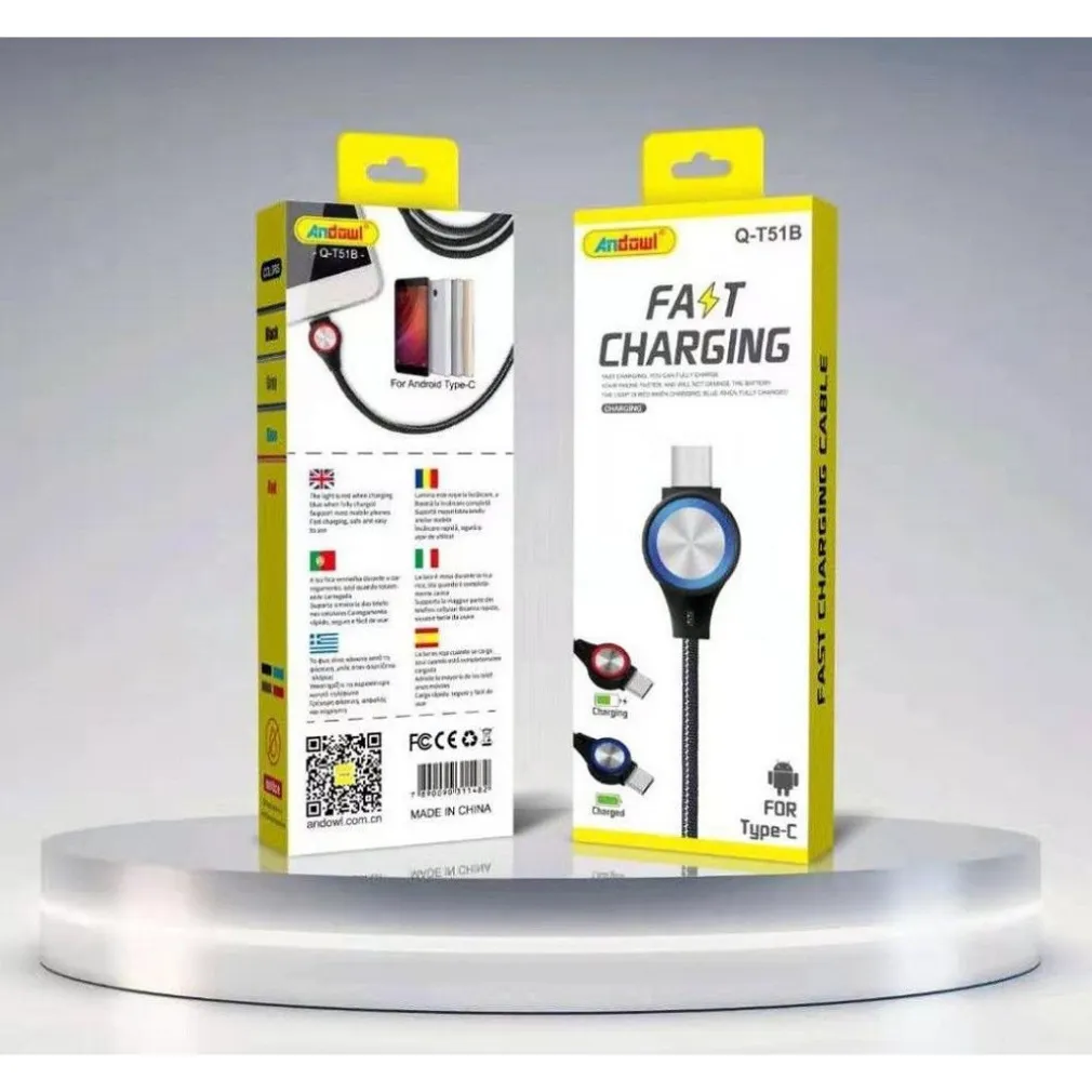 Cavo di ricarica rapida per android di tipo c con illuminazione. Ricarica veloce e sicura, la spia è rossa durante la carica e blu quando completamente carica.