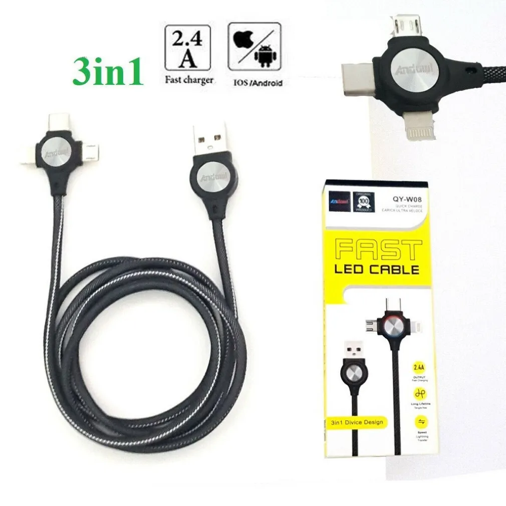 CAVO RICARICA DATI 3 IN 1 MICRO USB LIGHTNING TYPE C SMARTPHONE 2.4A FAST CHARGE