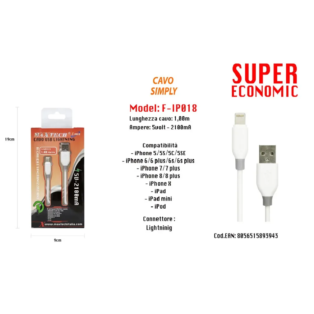 Il cavo dati collega l’iPhone 5 – 5S – 5C – 5SE – 6 – 6 PLUS – 6S – 6S PLUS – 7 – 7 PLUS – 8 – 8 PLUS – X, iPad o iPod alla porta USB del tuo computer per ricaricare e sincronizzare il dispositivo, oppure all’alimentatore USB per ricaricarlo in tutta comodità da una presa di corrente da muro.