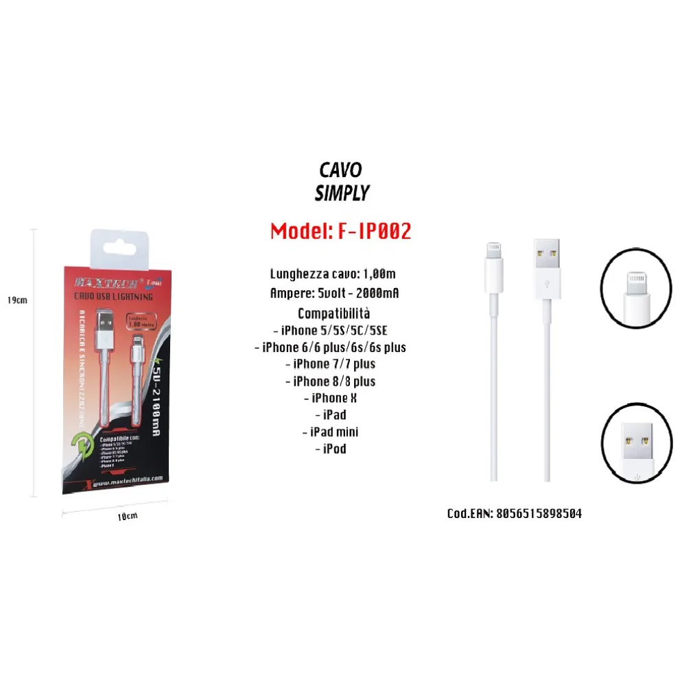 Cavo USB Simply Ricarica per iPhone iPad iPod 1 MT 5Volt-2000mA Maxtech F-IP002