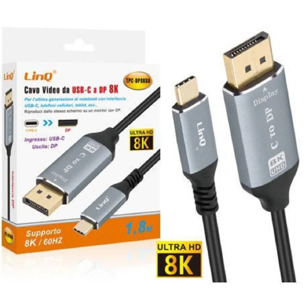 Cavo adattatore video da USB-C maschio a DisplayPort maschio. Consente di collegare smartphone, tablet e computer USB-C a un display DisplayPort. Perfetto per giochi, presentazioni, home cinema, videoconferenze, ecc. Supporta la risoluzione 8K / 60 Hz per una visualizzazione ad alta definizione. I connettori placcati in oro a 24 carati e il cablaggio in rame garantiscono una trasmissione affidabile del segnale. Misura 1 metro e 80, si collega agevolmente a casa, in ufficio, in sala riunioni, ecc. Non richiede alcuna configurazione, installazione Plug and Play. Design compatto e leggero, per la massima portabilità.