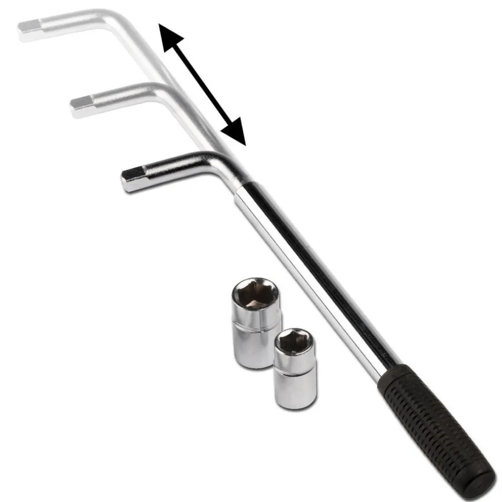 La chiave per dadi delle ruote è realizzata in acciaio e acciaio cromo vanadio è dotato di manico in gomma per un eccellente presa e fornisce il 10% in più di leva grazie al braccio telescopico che può allungarsi fino a 550 mm, inoltre gli inserti rimovibili da 17/19 mm e 21/23 mm inclusi nella confezione consentono l’utilizzo di questa chiave su tutti i modelli più diffusi.