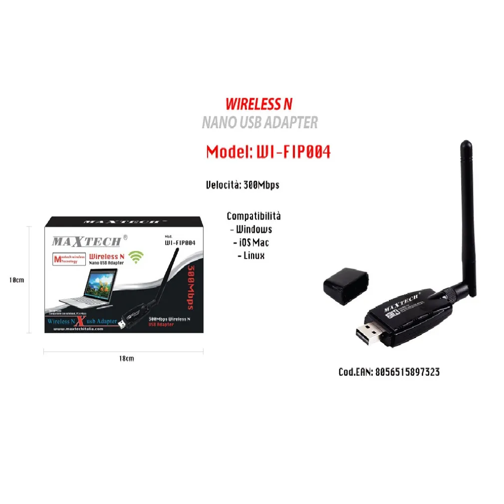 L’adattatore WiFi USB WI-FIP004 di MAXTECH è una soluzione affidabile e conveniente per aggiungere connettività wireless ad alta velocità ai tuoi dispositivi informatici. Progettato con prestazioni ottimizzate, questo adattatore nano wireless offre una velocità di trasferimento fino a 300Mbps, consentendoti di navigare in Internet, trasmettere video in streaming e scaricare file con velocità sorprendenti. Grazie al suo design compatto e alla sua antena WiFi integrata, l’adattatore si collega direttamente alla porta USB del tuo computer o notebook senza ingombrare l’area circostante.