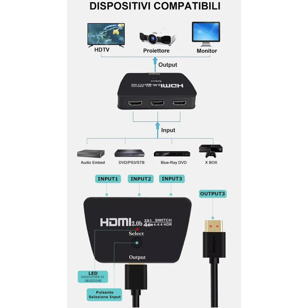 Commutatore Switch Splitter HDMI 3 sorgenti HDMI ad alta definizione su un unico schermo o monitor con ingresso HDMI. ll Commutatore consente una perfetta commutazione tra tre sorgenti HDMI su un display. La Commutazione della scelta HDMI avviene tramite tasto (SELECT). Il commutatore HDMI veicola il segnale video ad alta definizione (fino a 4K x 2K computer). Compatibile con HD-DVD,SKY-STB, PS4, Xbox one ecc… Risparmia i costi e la necessità di collegare e scollegare continuamente i diversi dispositivi ai cavi HDMI.