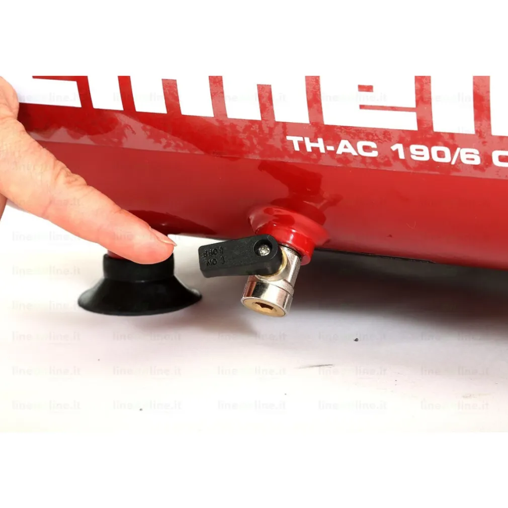 Inoltre la Einhell garantisce il serbatoio per 10 anni contro i danni causati dalla ruggine depositata sulle pareti. Forma compatta, particolarmente piacevole alla vista, il compressore Einhell TH-AC 190/6 OF è lo strumento migliore che puoi scegliere per eseguire tanti piccoli lavori per la tua casa che quotidianamente ti si possono presentare. La forma compatta, le dimensioni ridotte e la maniglia incorporata alla struttura ti permettono di spostare l’attrezzo e utilizzarlo ovunque tu ne abbia bisogno: ti sarà sufficiente collegarlo ad una presa di corrente elettrica domestica; una volta a riposo puoi avvolgere il cavo elettrico ai tre agganci posteriori per avere il compressore sempre in ordine. Spostando il tasto di accensione sulla posizione “I” dai l’avvio al compressore. Grazie alla legenda riportata sul serbatoio puoi controllare le caratteristiche principali del compressore e capire immediatamente se è l’attrezzo giusto che fa per te. Il manometro per il controllo della pressione interna al serbatoio ti consente di verificare istantaneamente il livello durante ogni fase dell’utilizzo. La manopola di colore rosso posta all’uscita dell’aria, regola il volume in uscita che potrai regolare ruotandola in senso orario. Grazie alla valvola di spurgo potrai effettuare la pulizia periodica del serbatoio: a fine lavoro, quando il serbatoio ha ancora un po’ di aria all’interno, ti sarà sufficiente aprirla e lo sporco depositato sulle pareti, uscirà con una leggera pressione all’esterno; in questa maniera avrai il compressore efficiente per lungo tempo. L’attacco dell’uscita aria è universale, ad aggancio rapido, adatto per utilizzare molti utensili ed effettuare tanti lavori: gonfiare, soffiare e verniciare con l’aerografo non saranno più un problema.