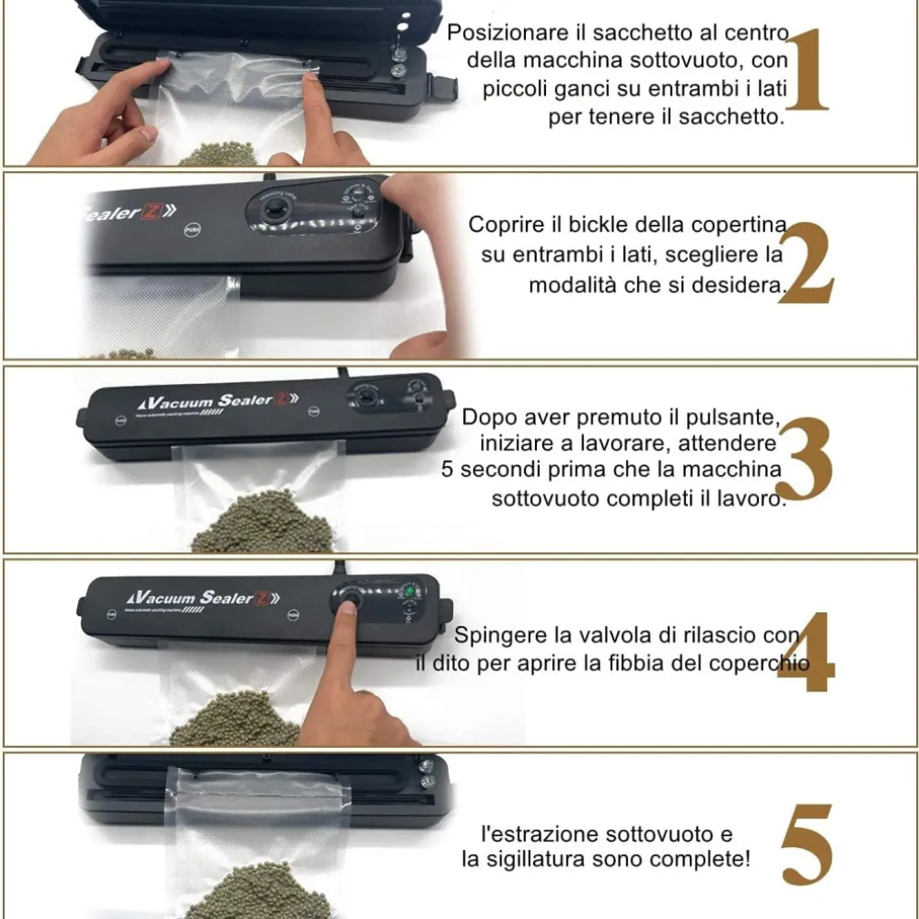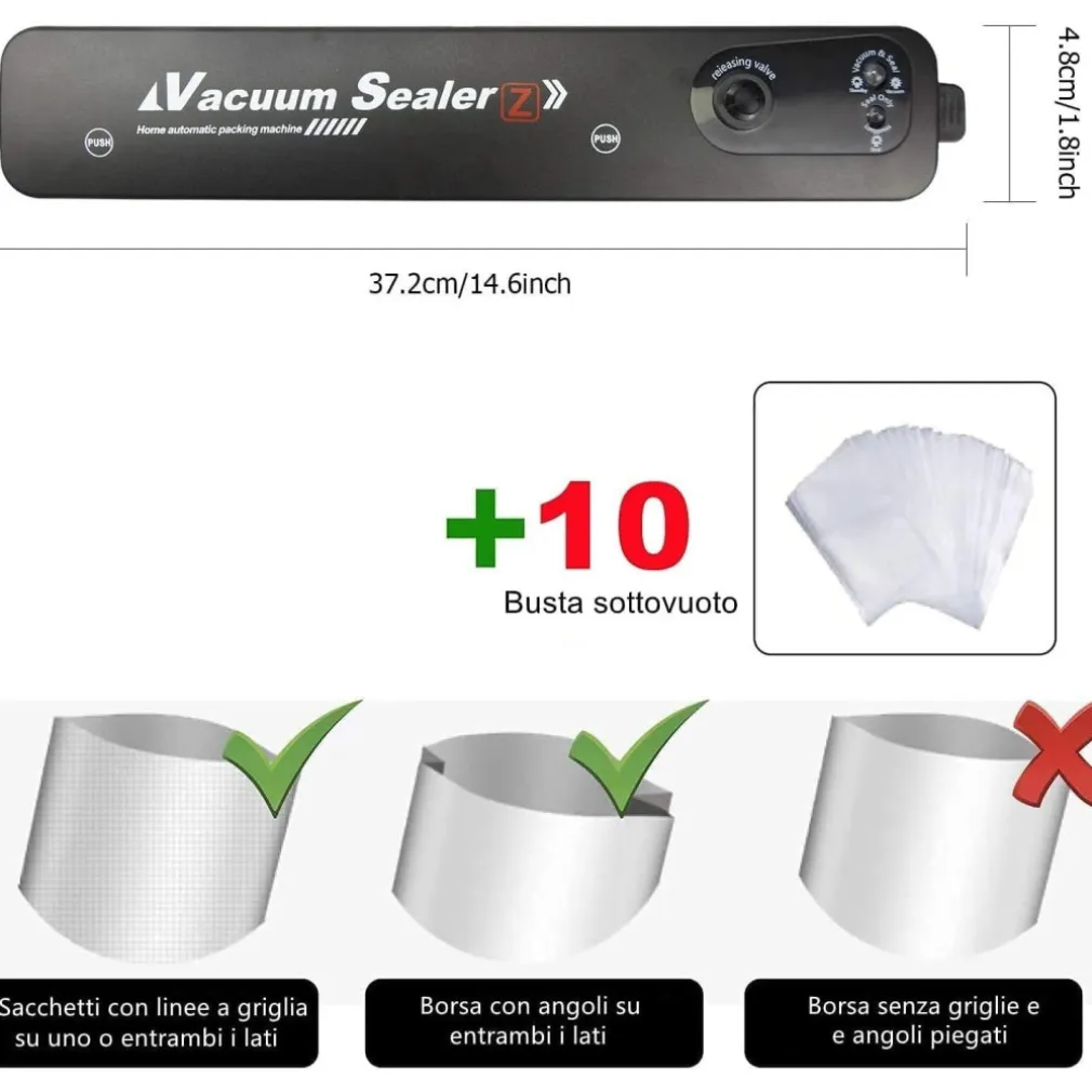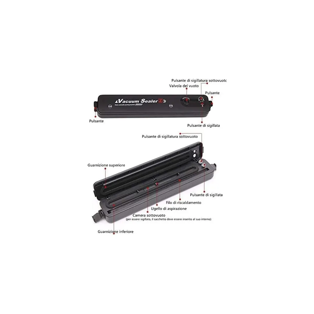 La macchina sottovuoto prolunga la vita degli alimenti rimuovendo la maggior parte dell’aria dai contenitori sigillati e impedisce all’aria fresca di fuoriuscire nei contenitori sigillati. Riducendo così l’ossidazione e aiuta a preservare il sapore e la qualità generale. Funzionamento della macchina sigillatrice sottovuoto per alimenti con un solo tocco e facile da usare, aprire il risparmiatore automatico di sigillatrice per alimenti e mettere il sacchetto nella camera sottovuoto. Quando la luce rossa diventa di nuovo verde, la sigillatura è completata e garantisce la vostra sicurezza. La food machine con un solo tocco puoi sigillare solo o mettere sottovuoto e sigillare i tuoi sacchetti. La confezionatrice sottovuoto per alimenti supporta una funzione 2 in 1 combinata con sottovuoto e sigillatura per alimenti secchi e umidi. Questa macchina confezionatrice sottovuoto per alimenti di livello professionale per la conservazione degli alimenti ti consente di scegliere l’intensità del tuo sottovuoto e le opzioni per gestire cibi secchi e umidi. Macchine per sigillare alimenti: un assistente indispensabile per la vita e la cucina. Vuoto intelligente a un pulsante, grande aspirazione, tenuta forte. Non è necessario avviare la pompa del vuoto, è possibile utilizzare la singola funzione di sigillatura per ridurre il consumo energetico. Sistema di controllo della temperatura intelligente NTC integrato, controlla automaticamente il tempo di sigillatura, migliora il lavoro efficienza e riduce il consumo di energia. Con la funzione di protezione da surriscaldamento per proteggere la macchina da danni ad alta temperatura. Facile da usare, può essere collegato al tubo di scarico, adatto a vari serbatoi di conservazione sottovuoto, deposito di indumenti, ecc., Comodo per la conservazione quotidiana.