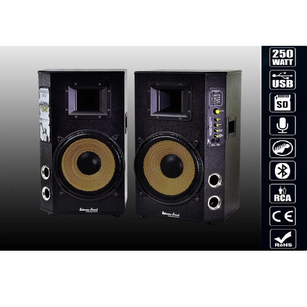 La coppia è formata da una cassa attiva ed una cassa passiva. Sono ottime per molteplici utilizzi, si adattano benissimo per MOLTEPLICI eventi e KARAOKE, in piccoli ambienti dove è richiesta musica tipo Pub, Centri di animazione, Residence, Sale convegni, Stabilimenti, Negozi di qualsiasi genere, Feste per bimbi e tanto altro!. Sono collegabili direttamente ad un computer utilizzando un cavo jack/RCA non in dotazione il che, le rende ottime anche come sole casse da PC. L’amplificazione dei microfoni e quella audio sono separate, in questo modo potete parlare solamente con i microfoni ed inserire la musica quando volete, potete anche sempre separatamente e a vostro piacimento inserire l’effetto ECO per dare profondità alla voce. IN PIU’ avete a disposizione un pratico lettore file MP3 con slot USB e slotcard SD, inserendo una PenDrive o una Card SD con dei file musicali mp3 potere direttamente ascoltare la vostra musica preferita. La scocca è in legno utilizzata per la costruzione di casse professionali con piedini in gomma per un appoggio sicuro, i componenti elettronici sono molto affidabili e l’amplificatore integrato è in grado di soddisfare tutte le vostre esigenze. Entrambe le casse hanno il foro in basso per poter essere posizionate cavalletti stativi. La connessione bluetooth permette di collegare le casse ad una periferica BLUETOOTH e sentire la vostra musica preferita senza collegare alcune cavo. Le casse possono essere posizionate su stativi o stand.