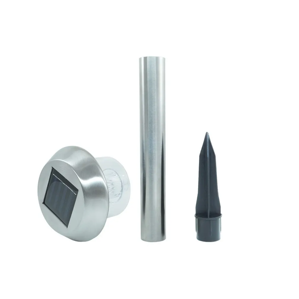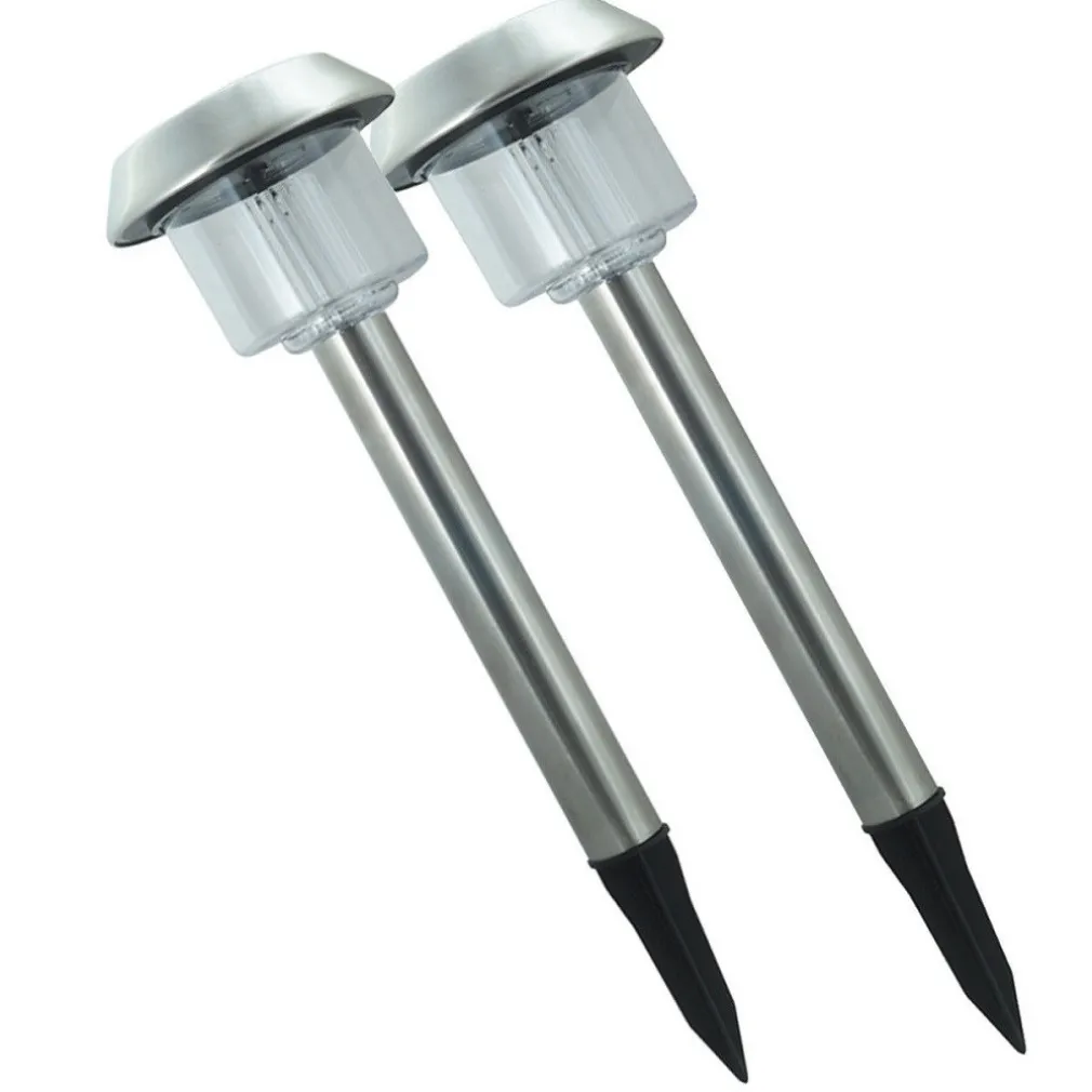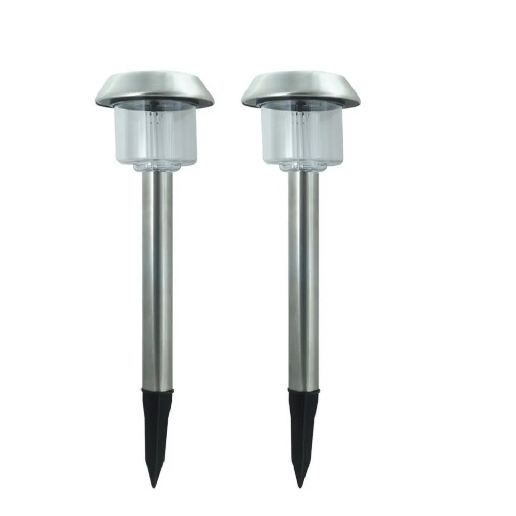 Pratica coppia di punti luce a lampioncini color argento satinato con picchetto da giardino per fissarli nel terreno e tenerli belli saldi, dispone di sorgente luminosa a led ricaricabile mediante pannello ad energia solare. Ideale per segnare percorsi in giardini o vialetti. Ecologico al 100% si alimenta con l’energia solare grazie pannello solare posto sulla parte superiore del lampioncino. Dispone di un tasto ON/OFF per disattivarla quando non serve, dotato di crepuscolare che consente l’accensione del LED solo quando è buio.