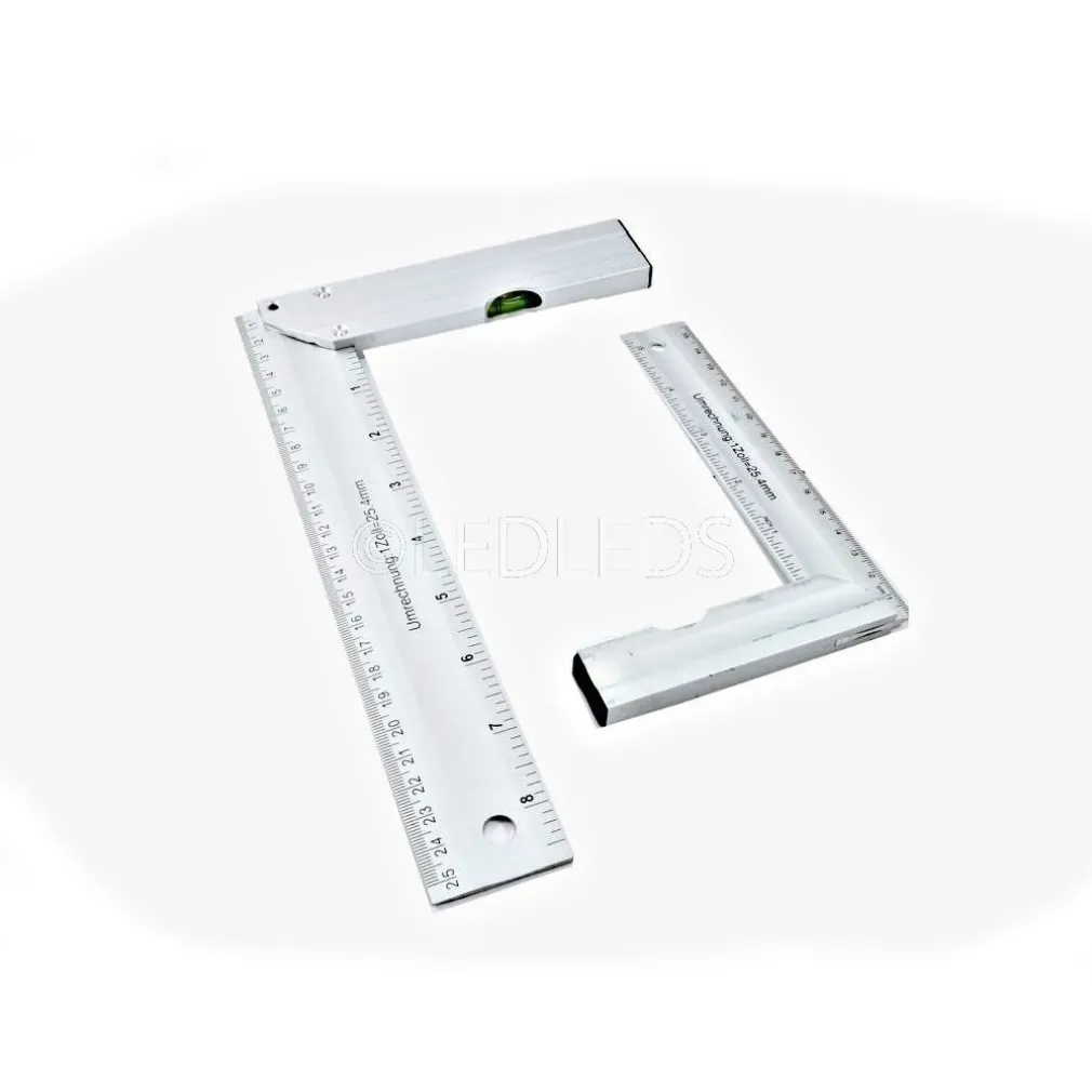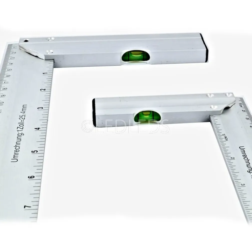 COPPIA DI SQUADRE IN ALLUMINIO CON LIVELLA; SET DI DUE SQUADRE IN ALLUMINIO CON BOLLA INCORPORATA PER VERIFICARE L’ESATTO LIVELLAMENTO DEL PIANO.