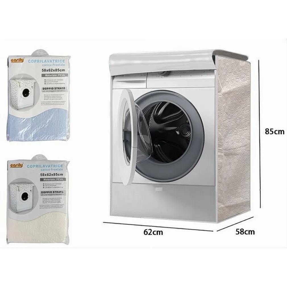 Le dimensioni del coprilavatrice sono 58x62x85 cm, progettate per adattarsi a diverse dimensioni e modelli di lavatrici, garantendo una vestibilità universale.