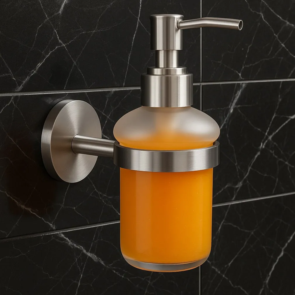 È un dispenser da parete per sapone liquido, realizzato in acciaio satinato e vetro satinato, pensato per migliorare l’estetica e la funzionalità del bagno.