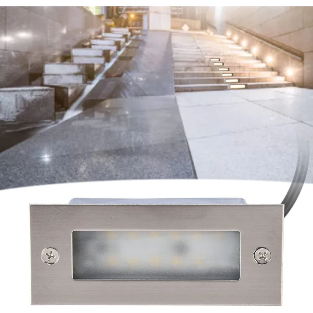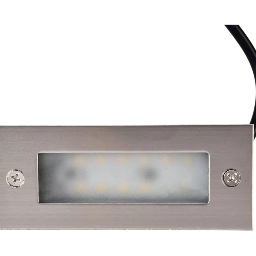 Un Faretto Led Segna passo da Incasso a Muro con 3 Led; Basso Consumo; schermo protettivo con vetro opaco; cornice frontale in acciaio. Modello Rettangolare con Vetro Opaco. Ideale per l’illuminazione segna passo dei corridoi, dei gradini, percorsi e vie di fuga oppure per creare effetti luminosi a parete.