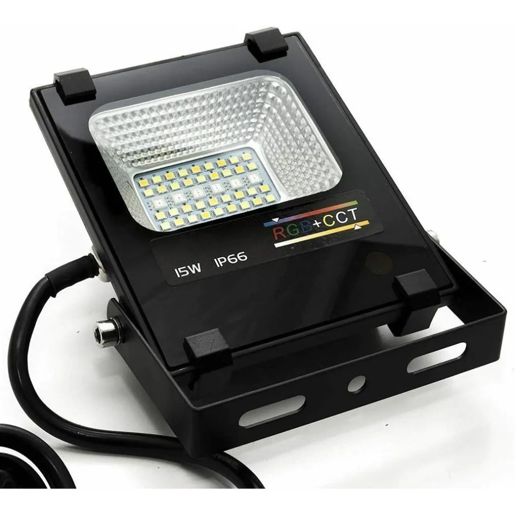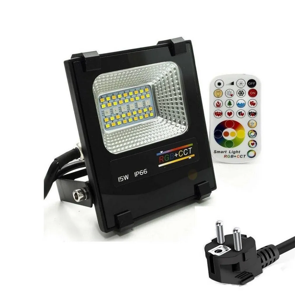 Faro led da 15W di potenza RGB+CCT con struttura IP66 in alluminio, utilizzato nell’illuminazione delle facciate esterne, dei giardini e dove è richiesta una luce colorata. Comandabile mediante telecomando (incluso) Particolarmente indicato per uso commerciale o residenziale, dispone di corpo in alluminio pressofuso, vetro temprato frontale e staffa regolabile. Il faro led RGB+WW ha un doppio chip led bianco CCT e RGB così da poter avere sia la luce bianca calda o fredda e all’occorrenza anche 16 colori diversi e 15 programmi di luce. Il Faro led RGB+CCT è comandabile da un telecomando (IR max. distanza 8 metri ) che permette il controllo colori luce e programmi luce. La portata di controllo del faro è di 8 metri. Proiettore a led con scocca in alluminio nero. Questo faretto grazie alla staffa che lo rende orientabile è ideale in ambienti esterni (grado di protezione IP66) come giardini, alberi, piante, facciate esterne, passaggi pedonali, illuminazione architetturale e insegne.