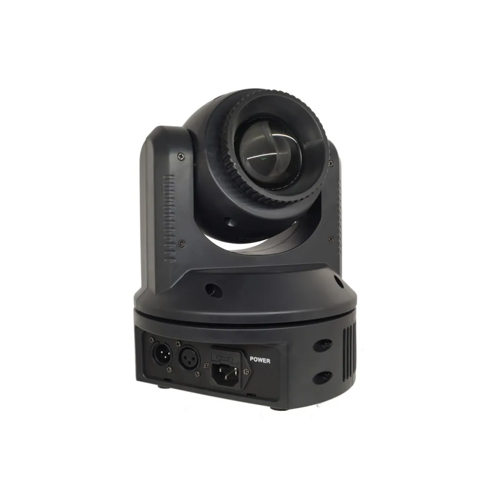 Faro con testa rotante a LED effetto disco colorato e strobo. Può essere montato a parete grazie alle staffe in dotazione, ma anche lasciato a terra o su di un ripiano grazie ai piedini in gomma antiscivolo. Può essere comandato a distanza tramite cavo DMX. Dal design compatto, offre tutte le funzioni che deve possedere una testa mobile di oggi. Adatto a qualsiasi ambiente: casa, discoteca, pub, locali per feste e in qualsiasi caso si necessiti il suo utilizzo. Nella parte frontale è presente il display ed i comandi per la programmazione. Nella parte posteriore sono presenti gli attacchi DMX e l’attacco all’alimentazione.