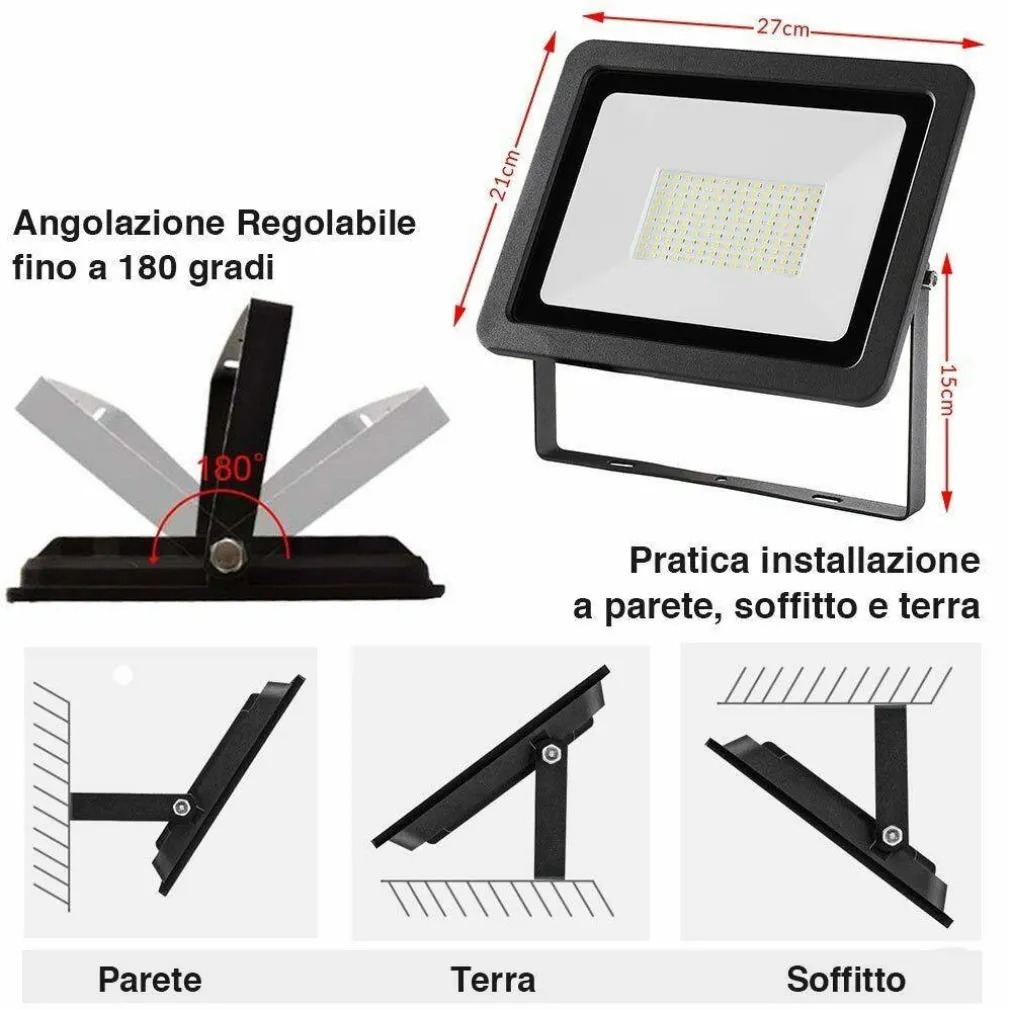Realizzato interamente in alluminio pressofuso di altissima qualità con vetro temperato frontale e coppa riflettente in materiale nanometrico, sicuro e resistente, che rende l’effetto di rifrazione 1.4 volte più alto rispetto ai fari led tradizionali. Design ultraslim e salvaspazio facile da installare grazie alla staffa di fissaggio con angolazione regolabile a 180 gradi che ne permette una facile installazione al soffitto, alla parate o a terra, perfetto per qualsiasi tipo di ambiente sia esso interno o esterno, questo grazie al grado di impermeabilizzazione IP65 che lo rende resistente a ruggine, pioggia, vento ecc.. rendendolo l’ideale in progetti di illuminazione per gli spazi all’aria aperta. I materiali utilizzati e le sue caratteristiche rendono il faro LED da esterno una fonte di illuminazione di altissima qualità, perfetto per illuminare ambienti esterni ed interni di case, ville e attività commerciali come negozi, bar hotel capannoni, garage ecc..