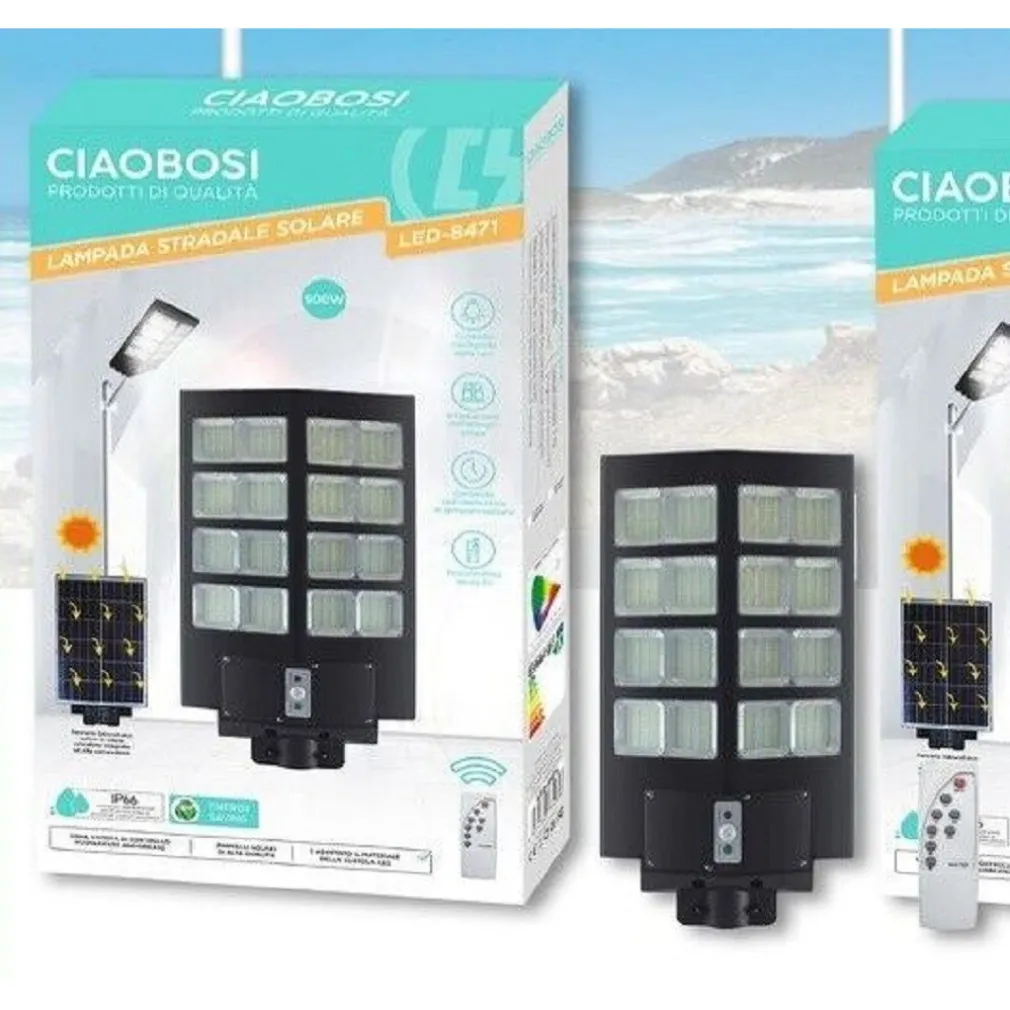 Lampione stradale con pannello solare, telecomando, sensore crepuscolare e di movimento.