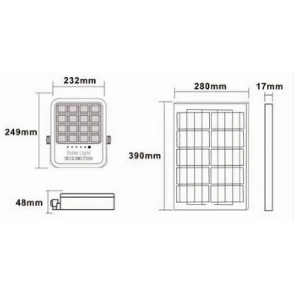 - Il faro LED, pannello solare, cavo di collegamento da 3 metri, telecomando e kit di installazione.