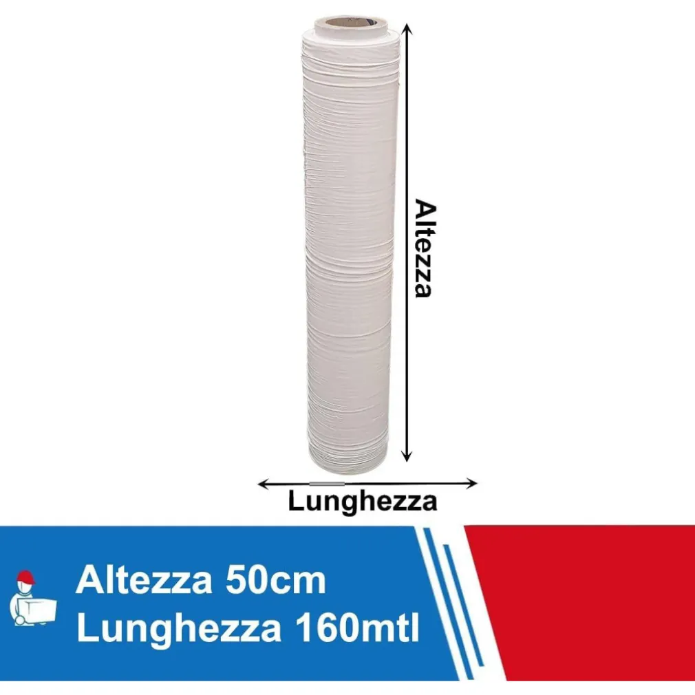 Film estensibile per uso manuale in polietilene coestruso a tre strati LLDPE, con tecnologia Cast, utilizzata per ottenere materiali termoretraibili ad alta resistenza e con ottima copertura. Grazie all’estrema resistenza alla perforazione, la pellicola consente l’utilizzo e la perfetta stabilità del carico. Ogni rotolo ha altezza di 50 cm, lunghezza 160 metri e spessore di 30 my, con peso di 2,2 kg