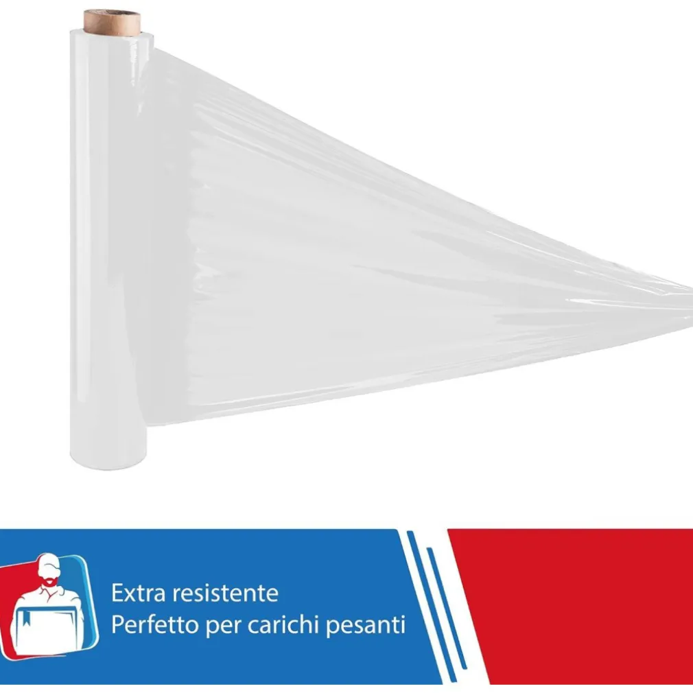 Film estensibile per uso manuale in polietilene coestruso a tre strati LLDPE (tecnologia Cast).E’ perfetto per lo stoccaggio dei vostri imballaggi o per proteggere gli oggetti durante un trasloco.