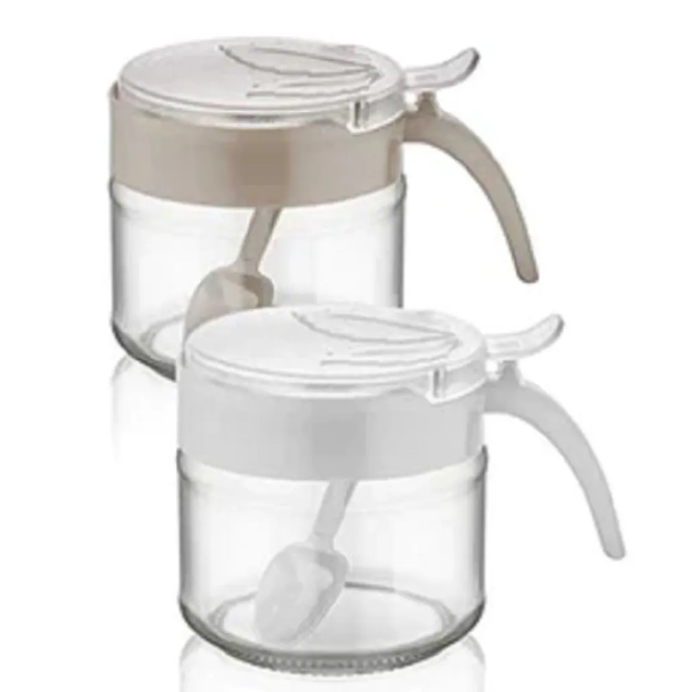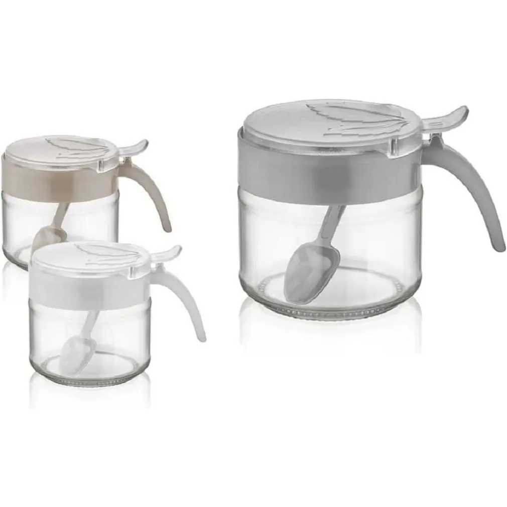 Formaggiera in vetro con cucchiaino incluso, 3 colori assortiti tortora, grigio, bianco. Prodotto da cucina per casa che contiene il formaggio per campeggio, mare, sport, picnic, parco.