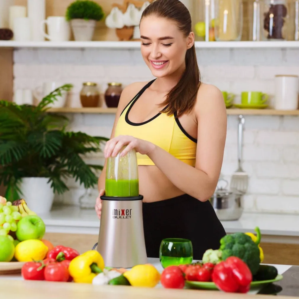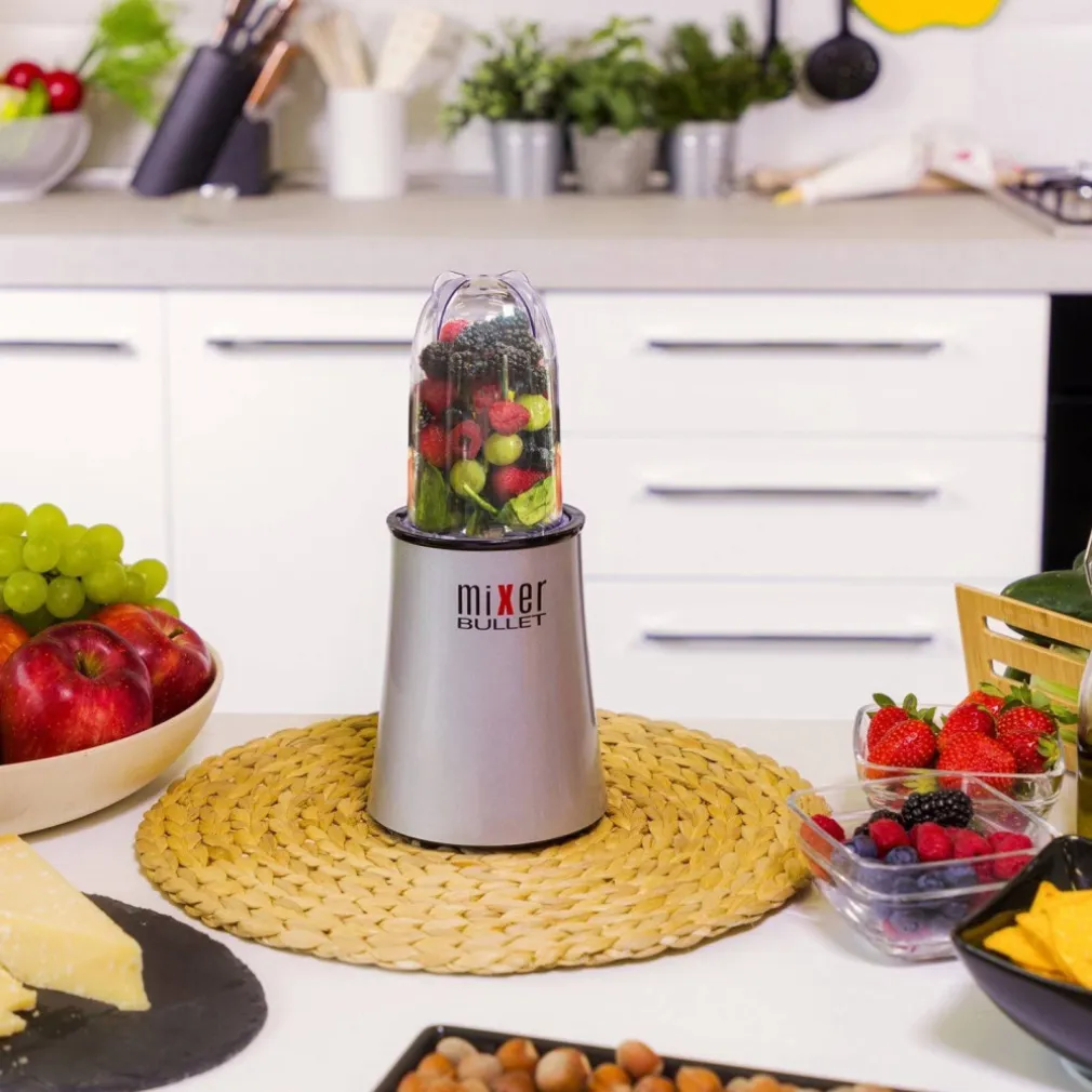 Mixer Bullet è il frullatore ultraveloce che in pochi secondi trita, monta e grattugia gli ingredienti delle tue ricette alla perfezione. 2 lame in dotazione: incrociata e piatta. La prima è ideale per frullare e tritare frutta e verdura, cipolle, aglio e miscelare il ghiaccio, oltre a mantecare creme e zuppe; la seconda è pensata per macinare e sminuzzare chicchi di caffè, frutta secca e montare panna e crema di formaggio. Inclusi nella confezione 4 coperchi per dosare cibi sbriciolati e polverizzati e per conservare cibi freschi nel bicchiere alto e basso in dotazione. Inoltre comprende 4 bicchieri party con bordo colorato facilmente riconoscibile per bere il tuo centrifugato in tutta comodità. Mixer Bullet è utilizzabile anche come pratico estrattore di succo e puoi aggiungere gli ingredienti anche quando il motore è in funzione. Potente e compatto, è un vero alleato in cucina. Pulire il corpo motore con panno umido. Bicchieri e lame lavabili sotto l’acqua corrente. Con ricettario.