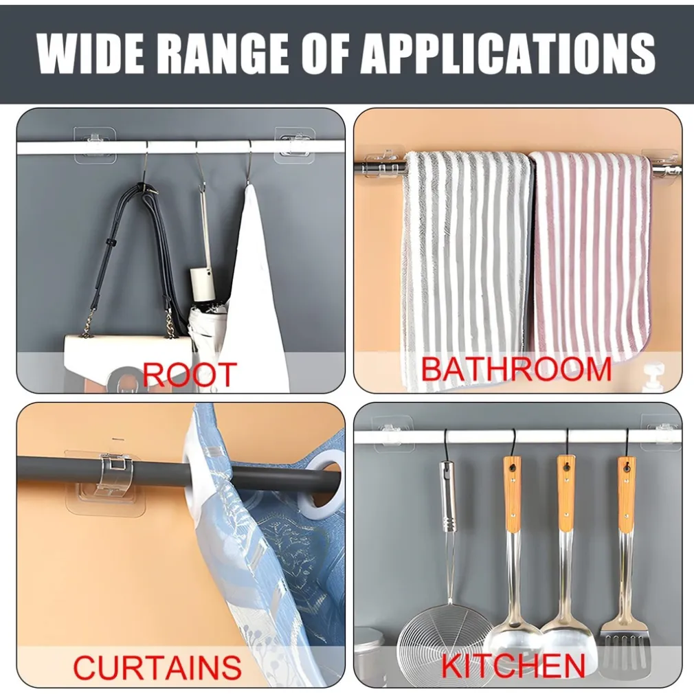 Cosa sono i ganci trasparenti autoadesivi? Sono supporti in PVC trasparente che permettono di appendere tende, garze e decorazioni senza forare le pareti, fissandosi grazie a un adesivo resistente. Dove posso usare questi ganci? Sono ideali per superfici lisce come vetro, piastrelle, marmo, specchi, legno e acciaio inossidabile. Perfetti in cucina, bagno, camera da letto o soggiorno.