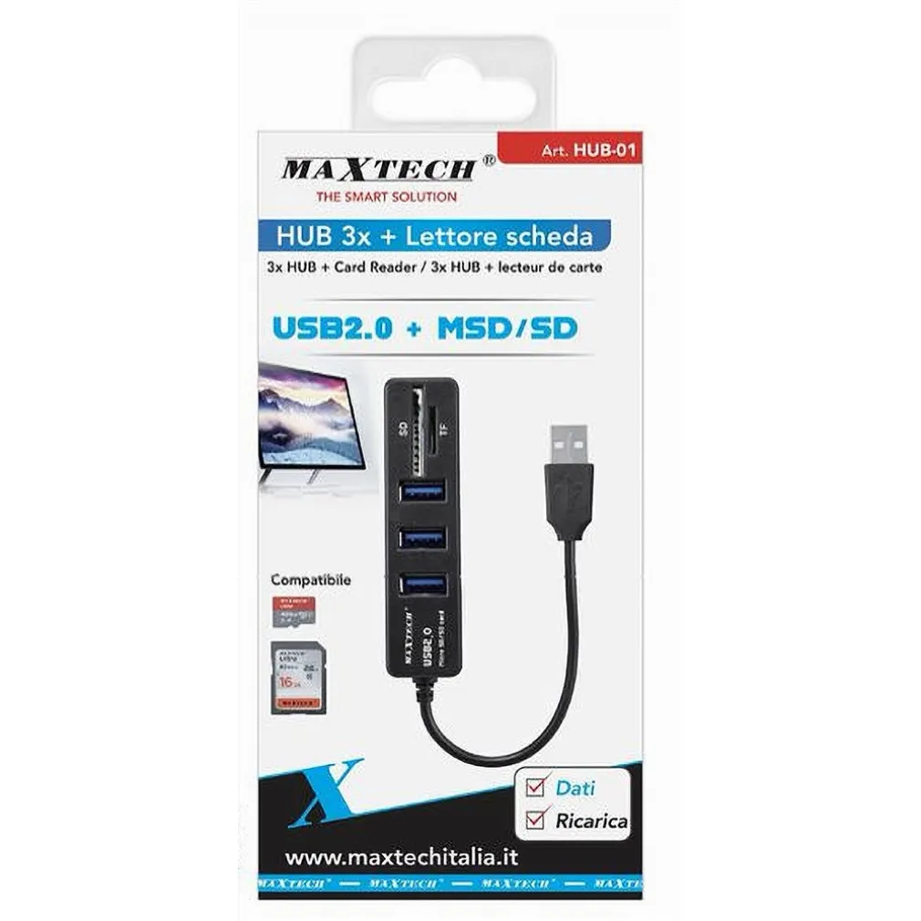 - 1 x HUB 3 PORTE USB 2.0 + Lettore di schede Micro SD/SD