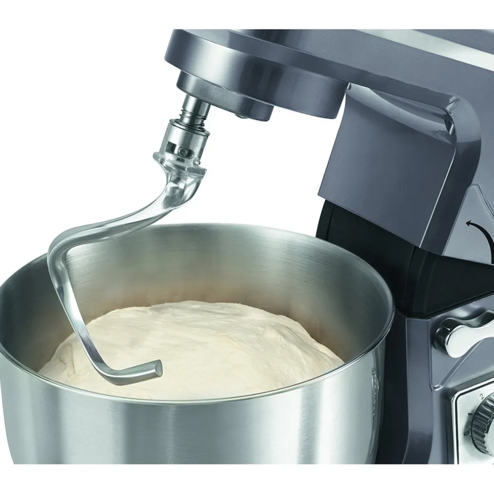 1000 W di potenza, ciotola removibile in acciaio con capacità 5 litri, pannello di controllo della velocità e 3 accessori inclusi: frusta per montare, frusta per miscelare, gancio per impastare.