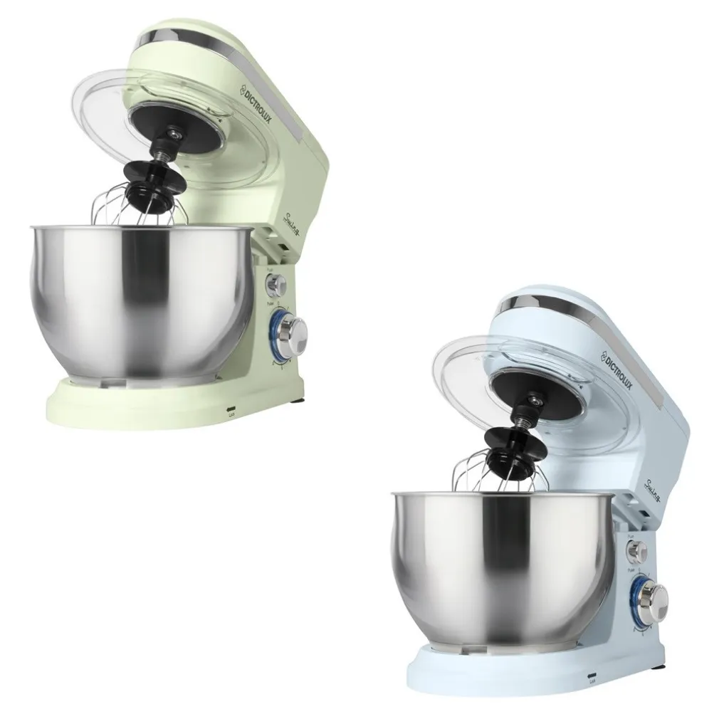 Disponibile nelle colorazioni verde e celeste, la planetaria unisce stile retrò e modernità. Il corpo in ABS robusto, i dettagli cromati e la manopola LED la rendono un complemento perfetto per ogni cucina. Il coperchio paraschizzi trasparente con apertura per l’aggiunta degli ingredienti assicura pulizia e praticità durante l’utilizzo.