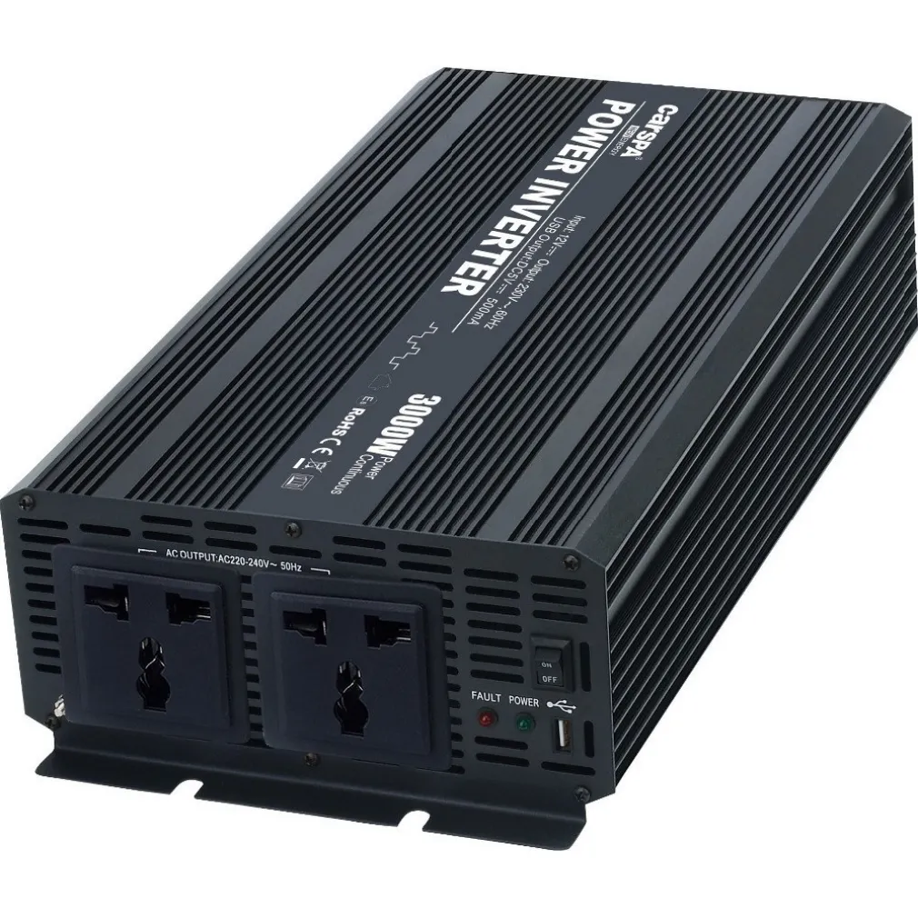 Inverter portatile in grado di trasformare una presa da 12V in una comune da 220V. Dalle dimensioni ridotte e semplicissimo da collegare grazie ai cavi in dotazione il potente inverter consente di avere una vera e propria presa da 220V in corrente alternata portatile. Il prodotto monta una ventola di raffreddamento che vi darà una maggiore sicurezza durante l’uso. All’interno della confezione troverete un cavetto per collegare l’inverter alla batteria dell’auto. Il convertitore potrete usarlo in auto, in camper o in barca, collegando notebook, trapani, televisori, stereo o qualsiasi apparecchiature (senza resistenza) che per funzionare hanno bisogno di una tensione di 220 volt e che non superino l’assorbenza massima di 3000W