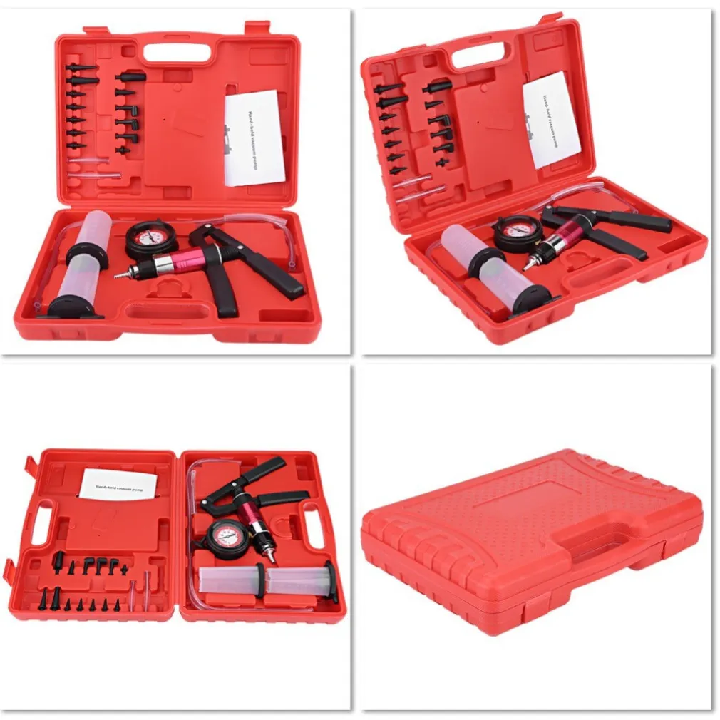 KIT TESTER E POMPA PER SPURGO FRENI A VUOTO. Con il Tester, si può facilmente verificare la tenuta del sistema frenante o condizionatori d’aria senza elettricità o aria pressione, spurgare o cambiare liquidi per freni. Pratico adatto per quasi tutte le auto. Controlli di vuoto / pressione azionate componenti auto motive. Può essere usato per spurgare sistemi idraulici o fluidi sifone.