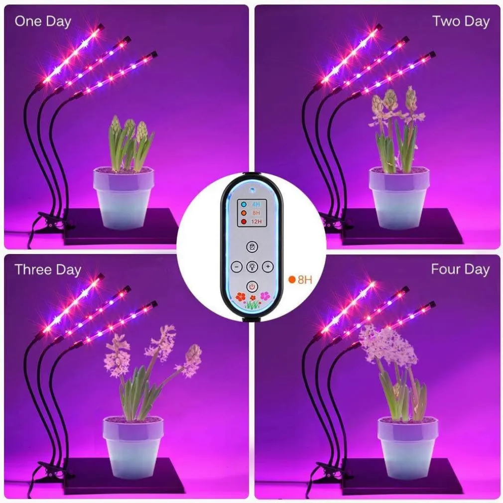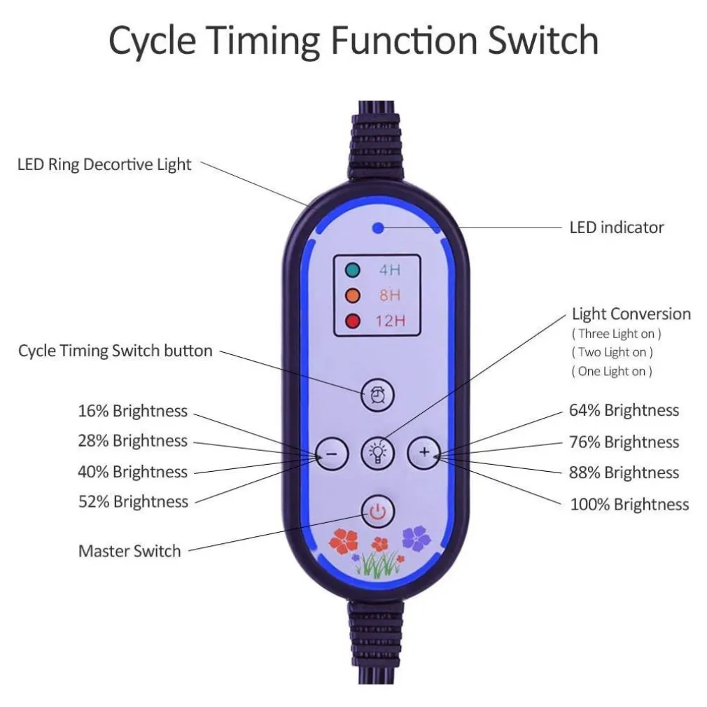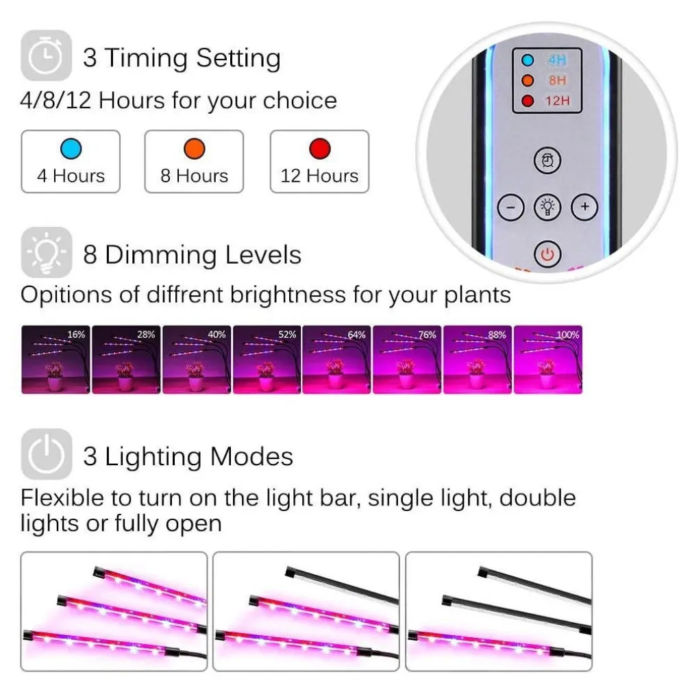 - Premere il pulsante di temporizzazione e impostare il tempo di 4/8/12 ore in base al piano; Una volta impostato, la lampada per piante indoor si accenderà e si spegne automaticamente allo stesso tempo OGNI GIORNO! Lascia che si prenda cura delle tue piante preferite anche quando sei in vacanza o fuori durante il fine settimana