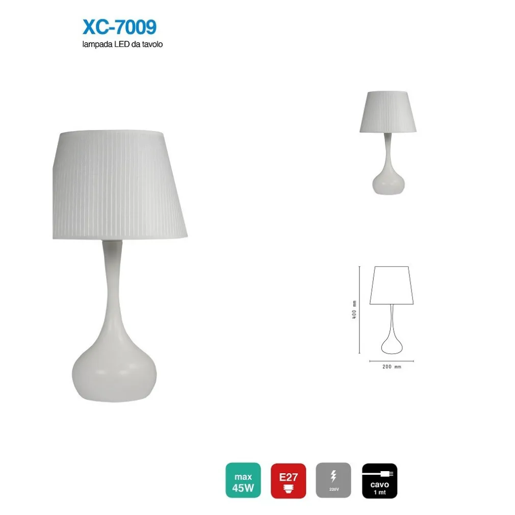 Moderna lampada da tavolo o scrivania in termoplastica interamente bianca, dal design minimal e molto moderno. Con attacco lampada base E27 e con cavo di lunghezza 1 metro, risulterà idonea per l’applicazione di ogni lampadina con tradizionale attacco a vite E27. La forma moderna si sposa perfettamente con lampade bianco freddo.